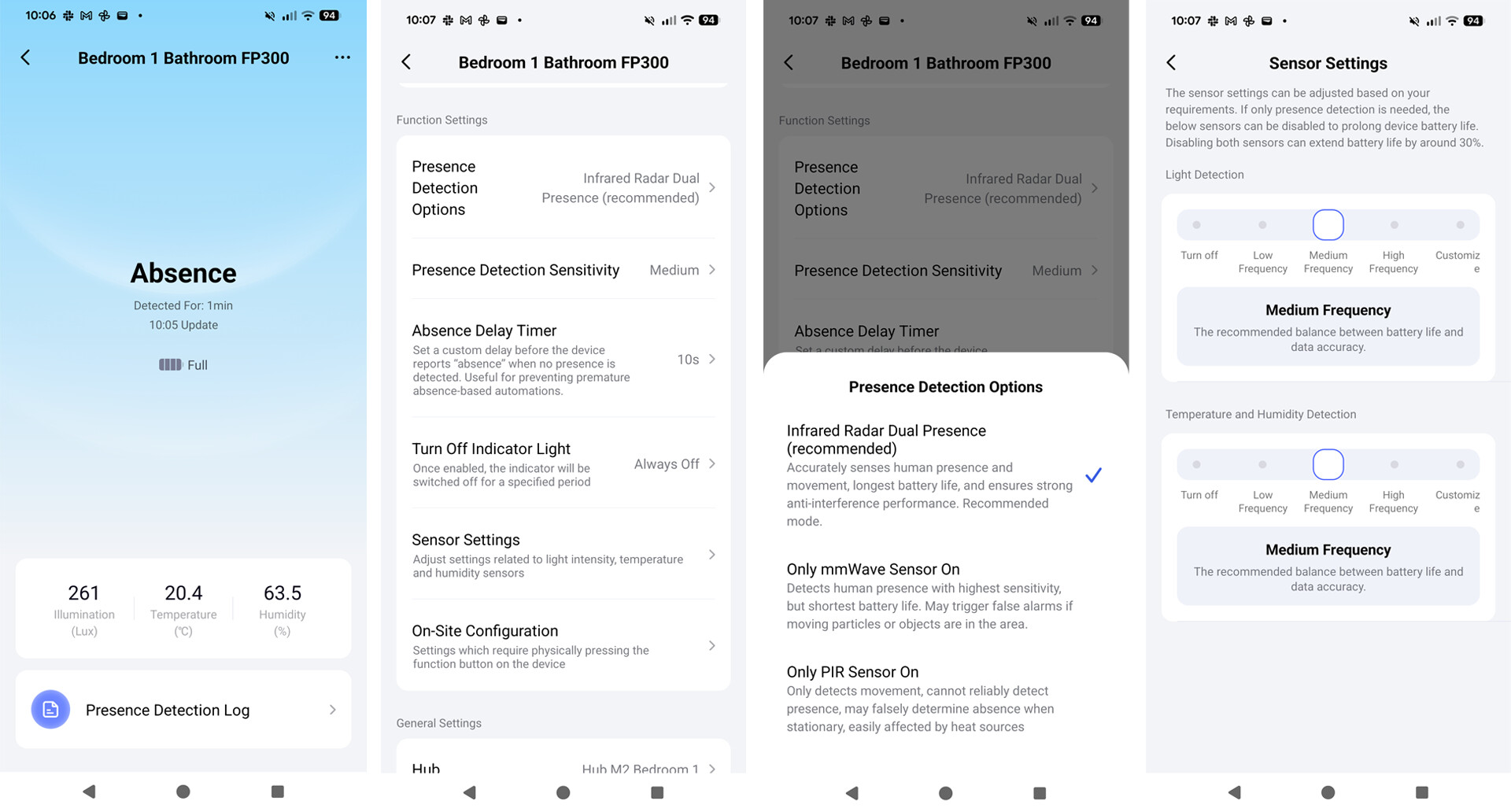 A standout capability is its ability to maintain presence detection even through a shower screen — something many sensors struggle with. During testing, the FP300 consistently detected occupancy while someone was showering, without false triggers or dropouts.