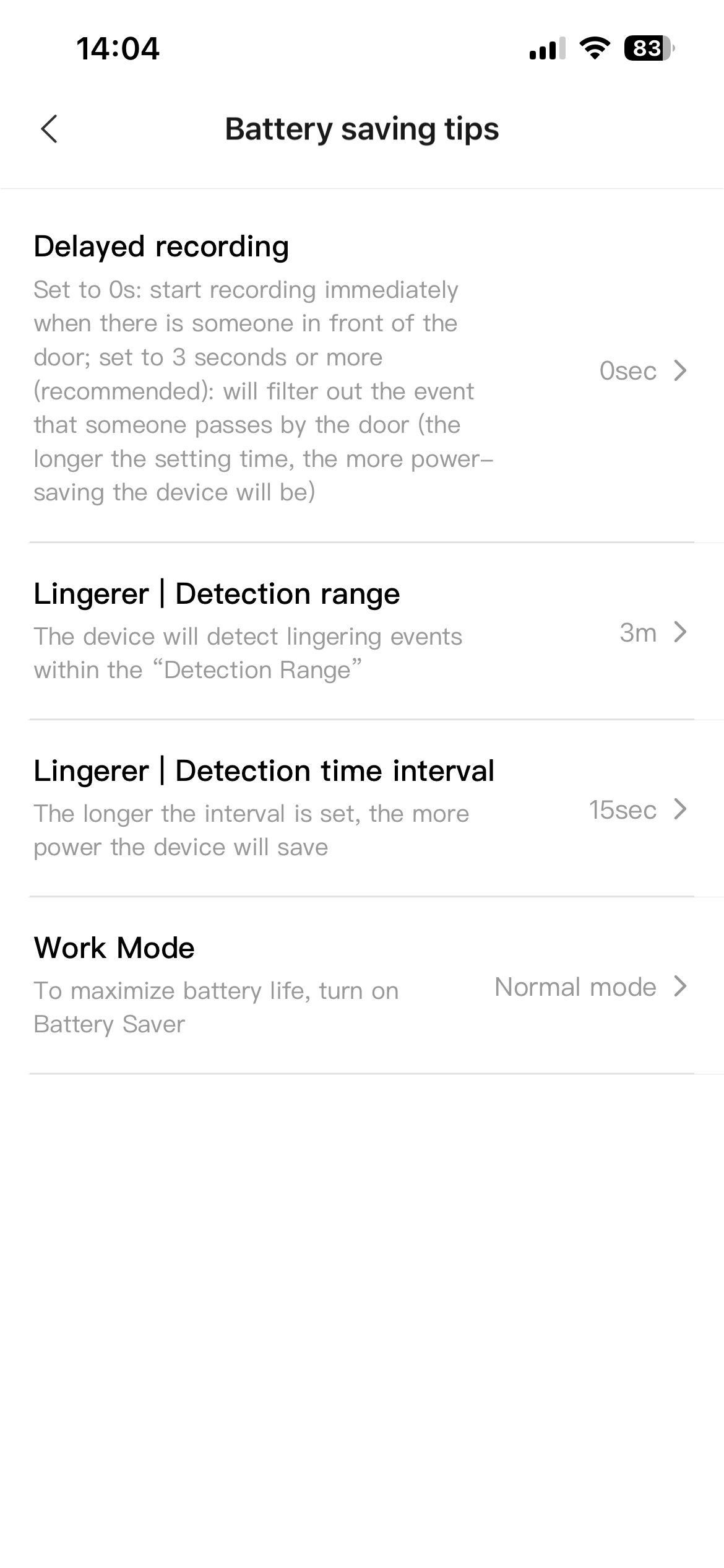 I use batteries and my battery value is now at 60% since September 4. These functions I use: Doorbell (with recording), Tamper Alarm and Linger Detection (between 21-07 and Proximity Trigger) I change batteries about every 3 months. See also tips under Battery saving tips.