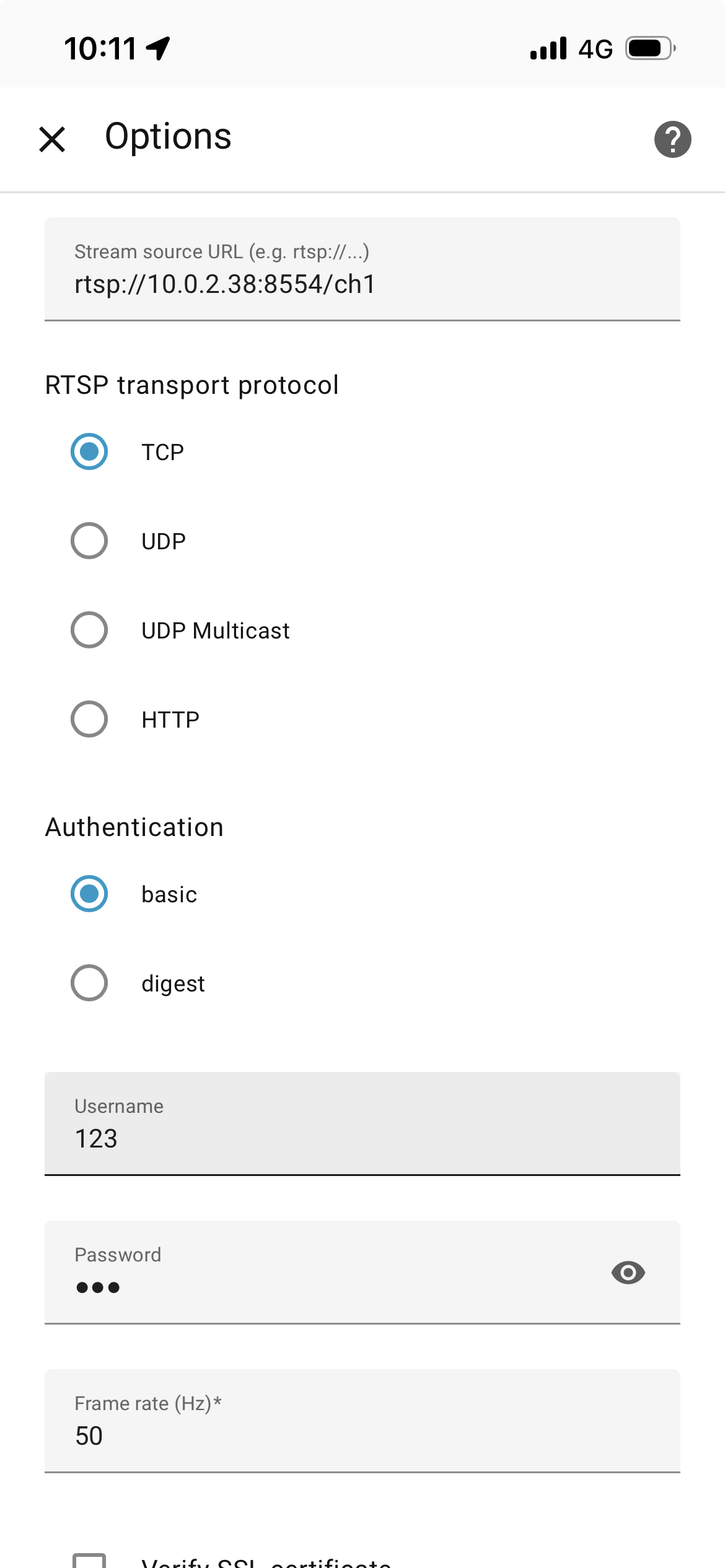 Tried every option: TCP/UDP for RTSP transport protocol, Digest/Basic authentication, credentials both in URL and in fields, leaving still image URL empty, SSL verification checked and unchecked.