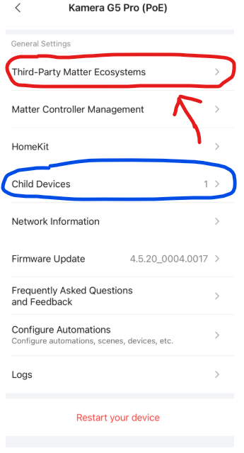 WARNING: The “Child Devices” marked in blue here are forwarded to Apple Home simultaneously via the HomKit and Matter connection, which means that all “Child Devices” of the G5 Pro are displayed twice in Apple Home!