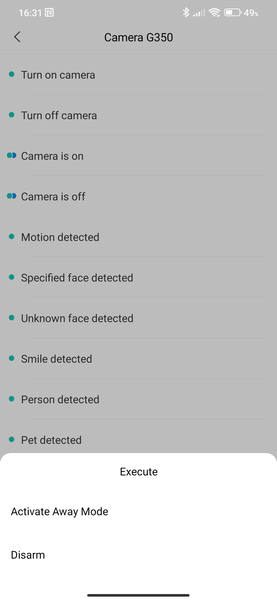 Actually, not quite true… you NEED HomeGuardian for that (see attached image). And one of the cameras does turn on Away but the other one doesn’t. I trigger Away mode via Mini Button Switch.