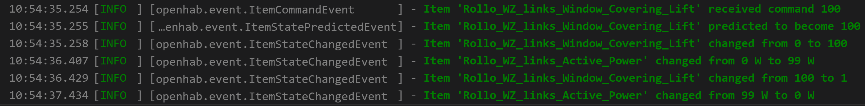 Here is btw the log from OpenHAB, showing that it sends the command correctly and shortly thereafter receives from the device, the new state as “1”.