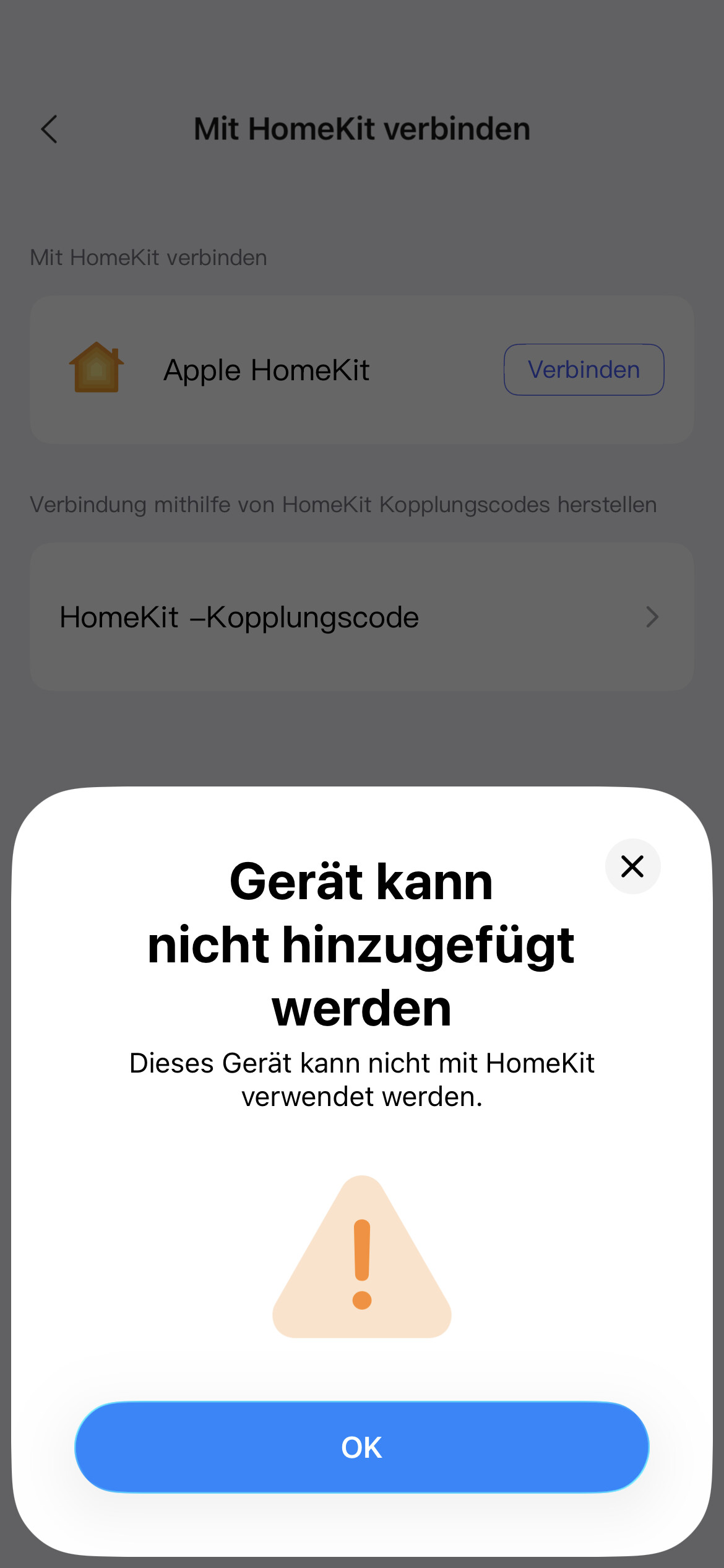 Wenn ich in der Aqara-App die Kamera zu Homekit hinzufügen will, so wird die Kamera gefunden, kann jedoch nicht zu Homekit hinzugefügt werden.