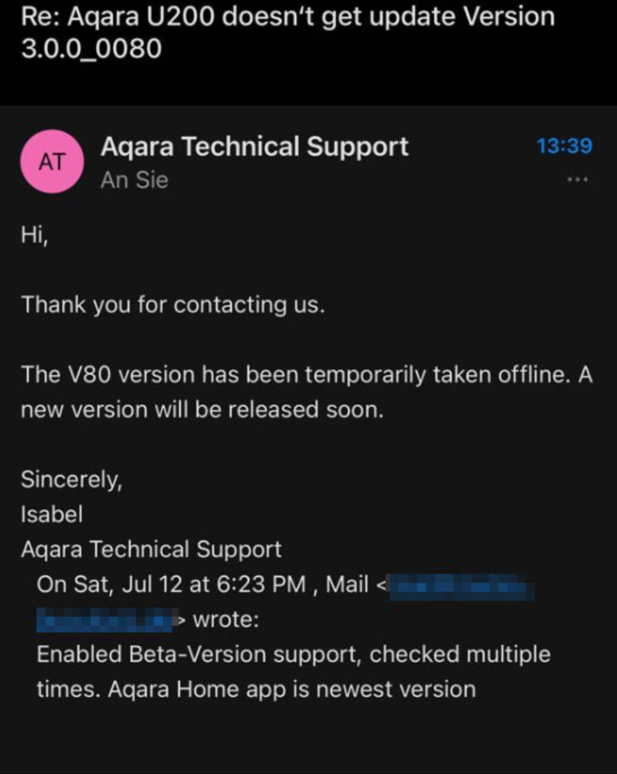I’m having trouble updating my Aqara U200 to firmware version 3.0.0_0080. Despite enabling beta firmware option, updating the aqara app, the device just won’t receive the update. It stays on the current firmware 3.0.0_0077, and the update doesn’t show up in the Aqara app (EU region).