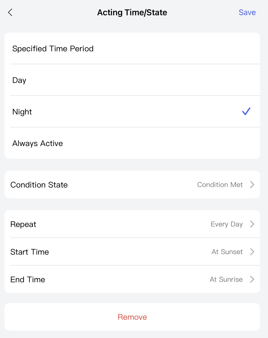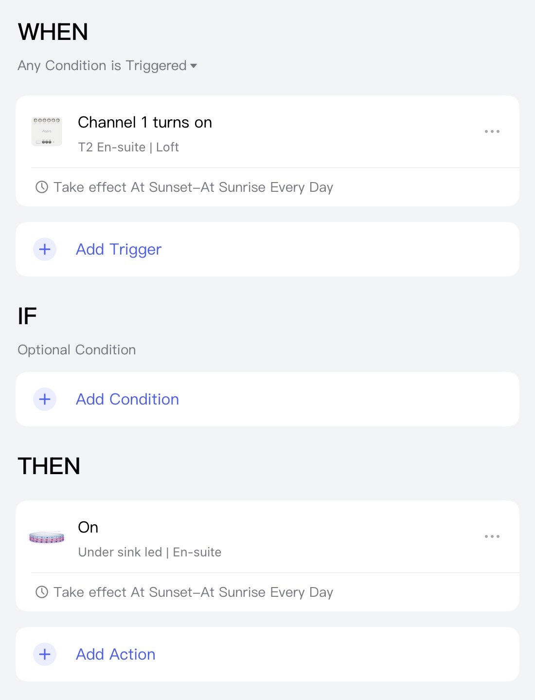 When old style PIR no longer senses movement it stops power to Aqara T2 Relay. Automation then says When T2 Turns Off, Then AQARA T1 LED Strip = Off.