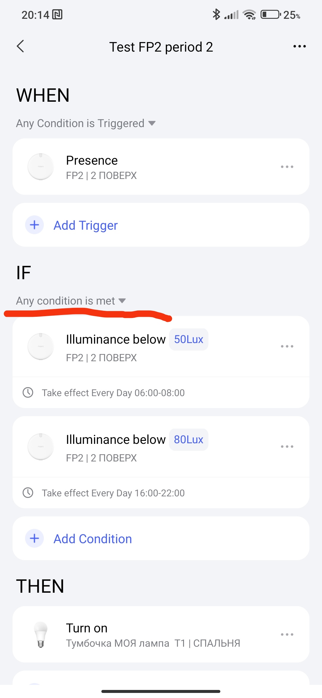 I have an automation that’s triggered when someone is detected by the FP2, but only if the light level is below 30 lux.