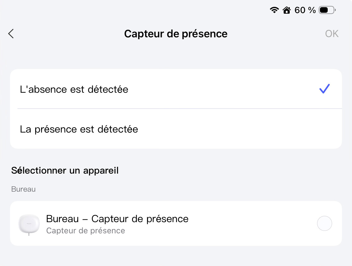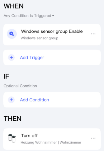 This principle can also be applied to other sensors, such as multiple presence sensors, which can activate or deactivate an automation, e.g. ‘someone is at home’.