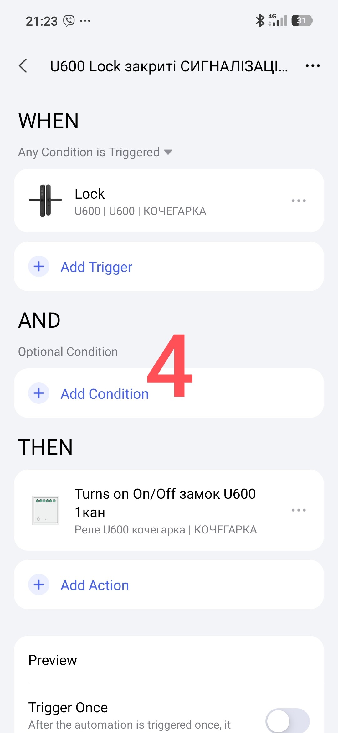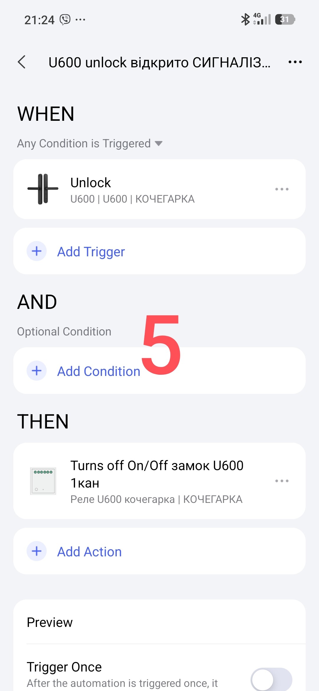 Second automation “U600 UnLock” (open ALARM). Automation is very simple.