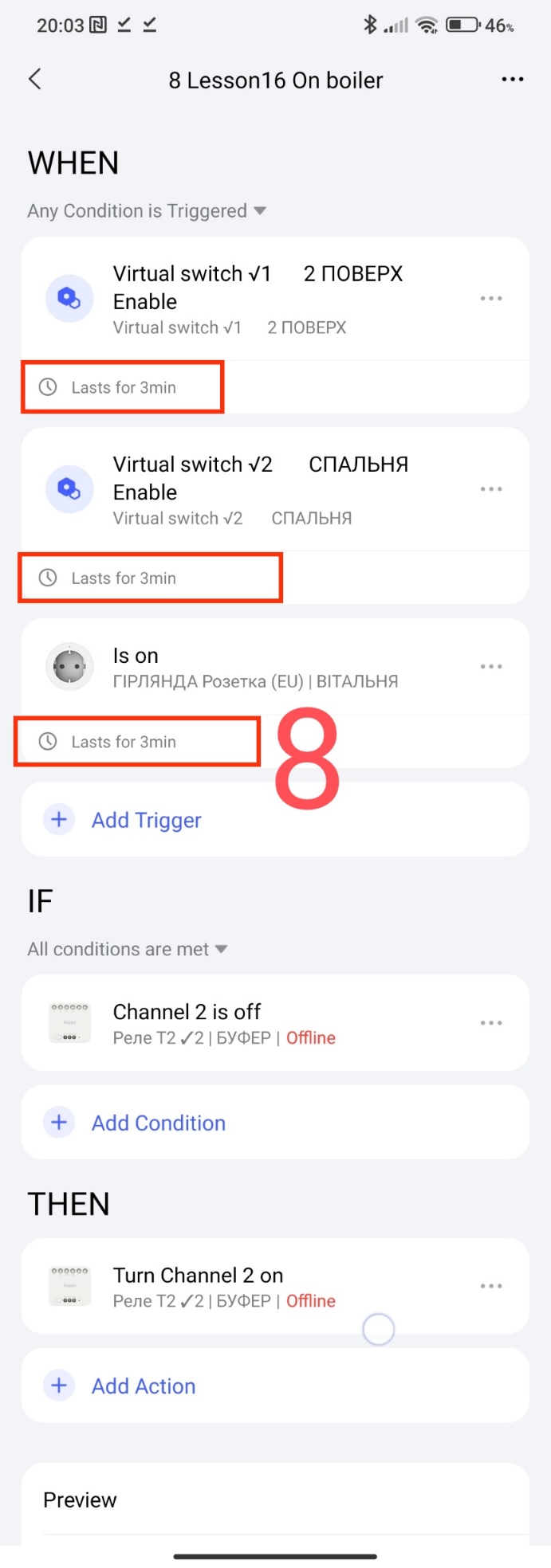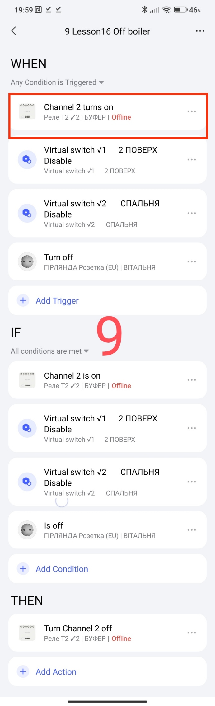 Automation Off of the heating boiler in the WHEN section set the condition On of the boiler (relay T2 2 channel) so that in case of erroneous switching on the boiler immediately turns off (Off).