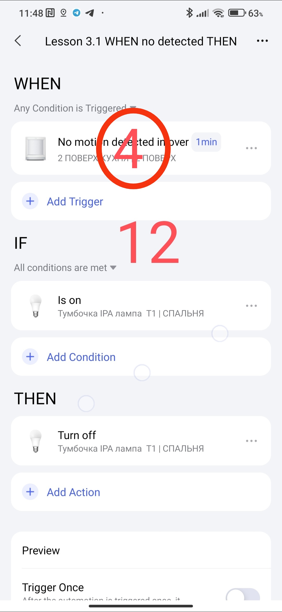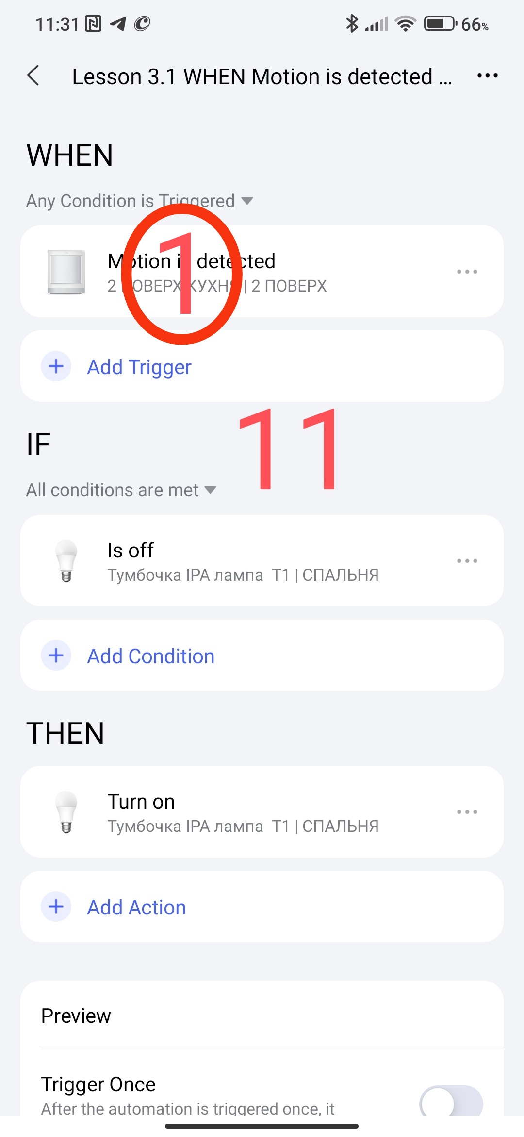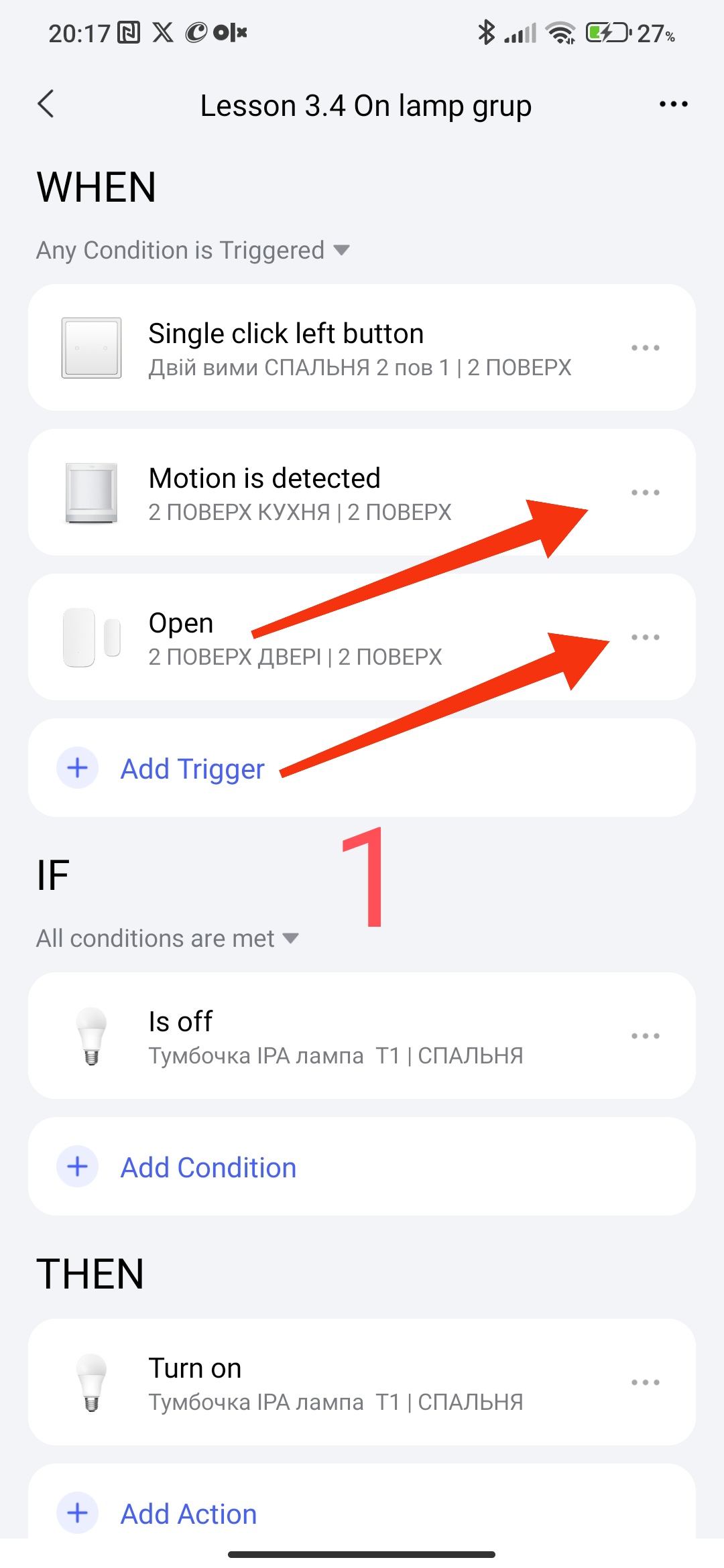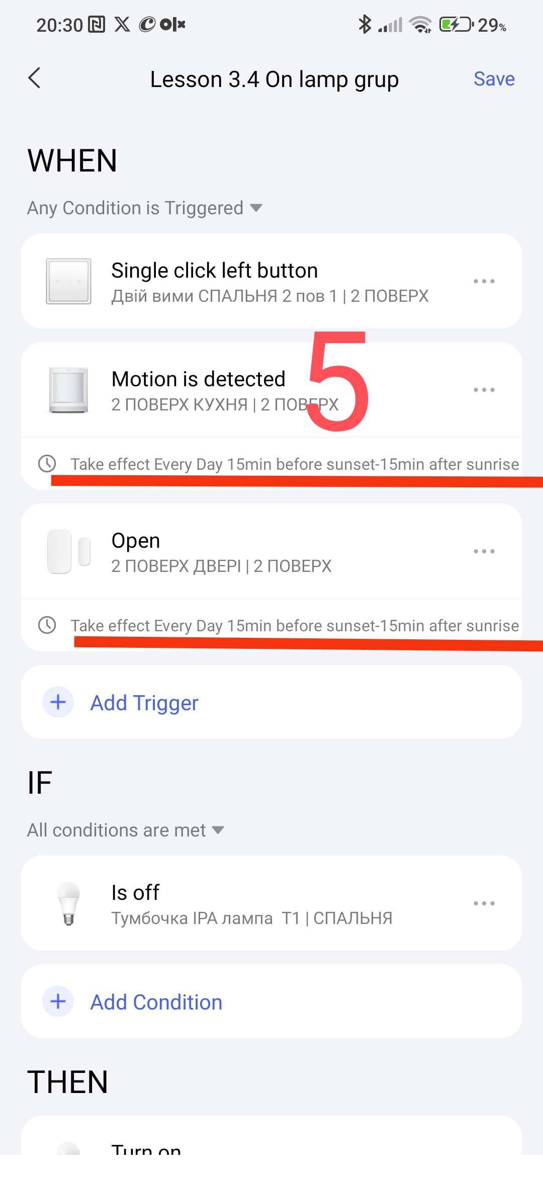Let’s supplement this automation with the “night” activation period, from lesson 2 we will go to the “…” settings and select “Acting time” for the motion sensor and the opening sensor.