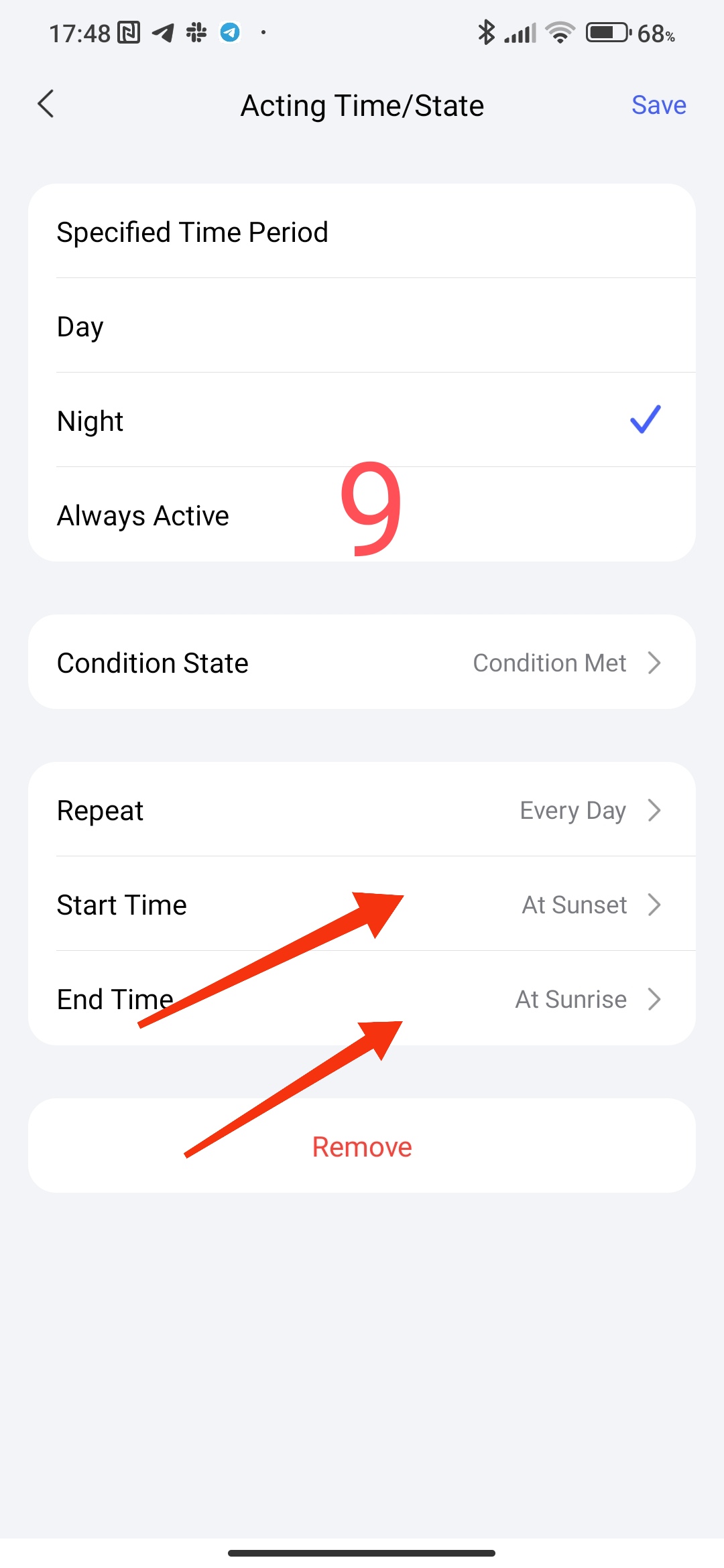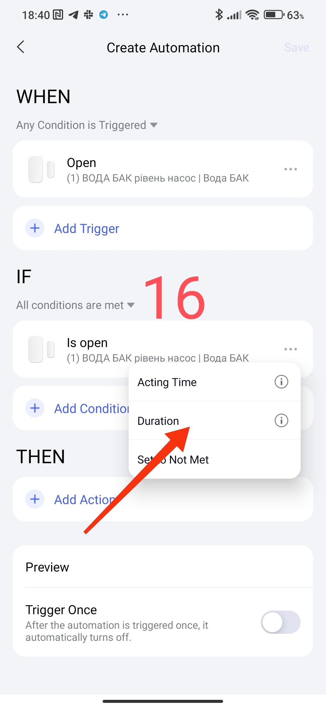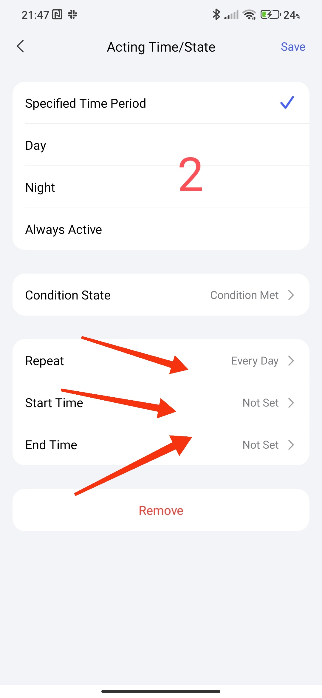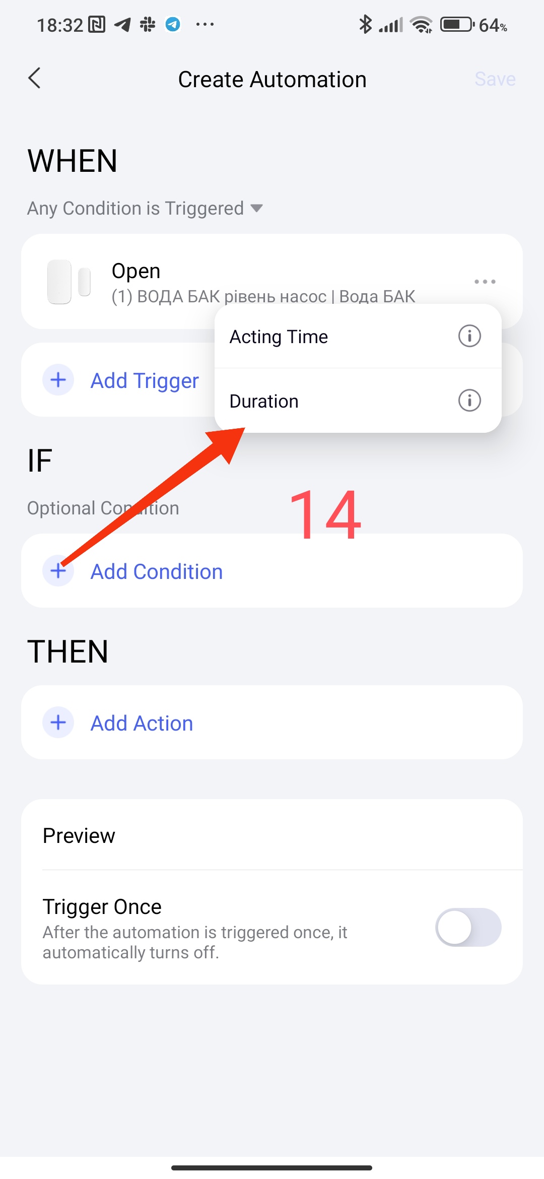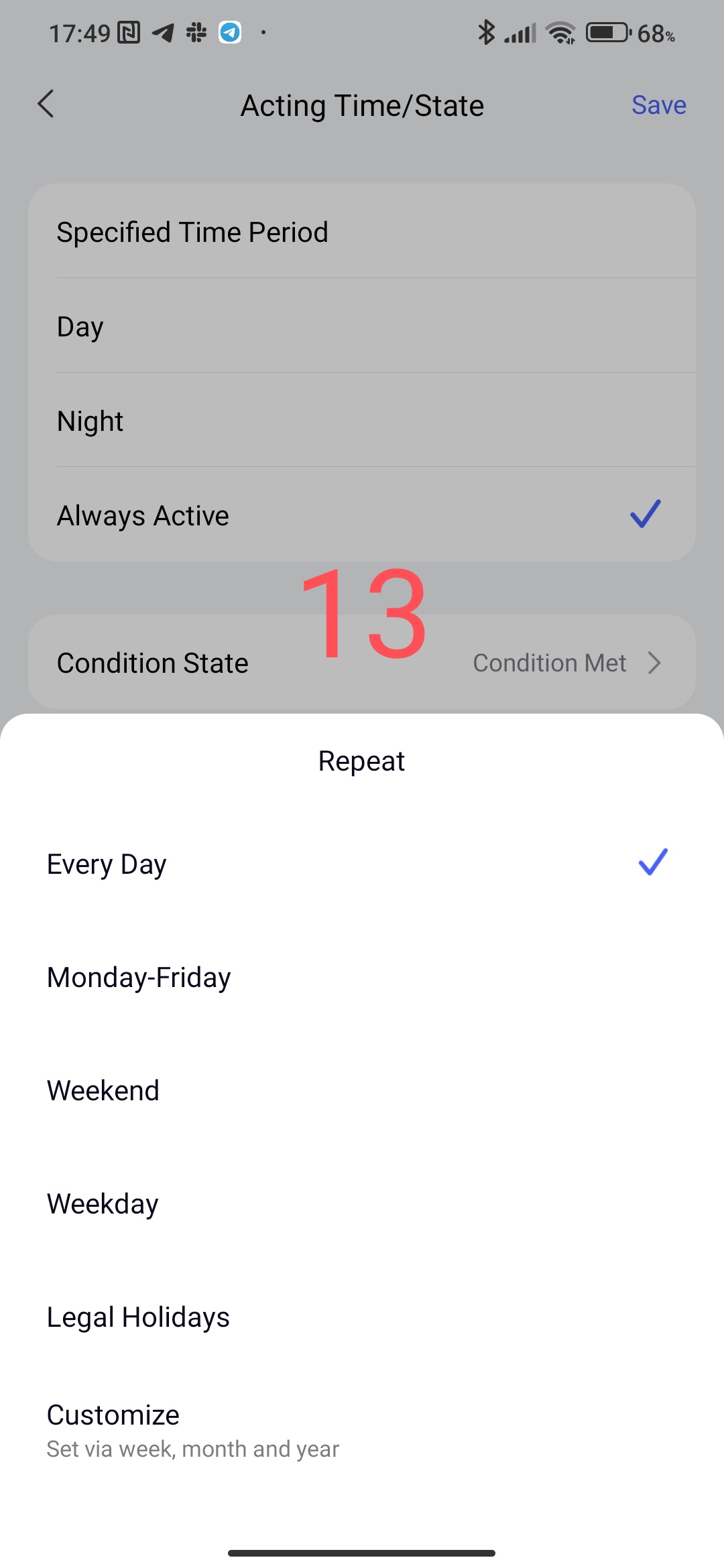 The first condition, the time interval for executing the conditions. In this setting, you can select the period for controlling the sensor or the condition of the device state (selected hour, day, night).