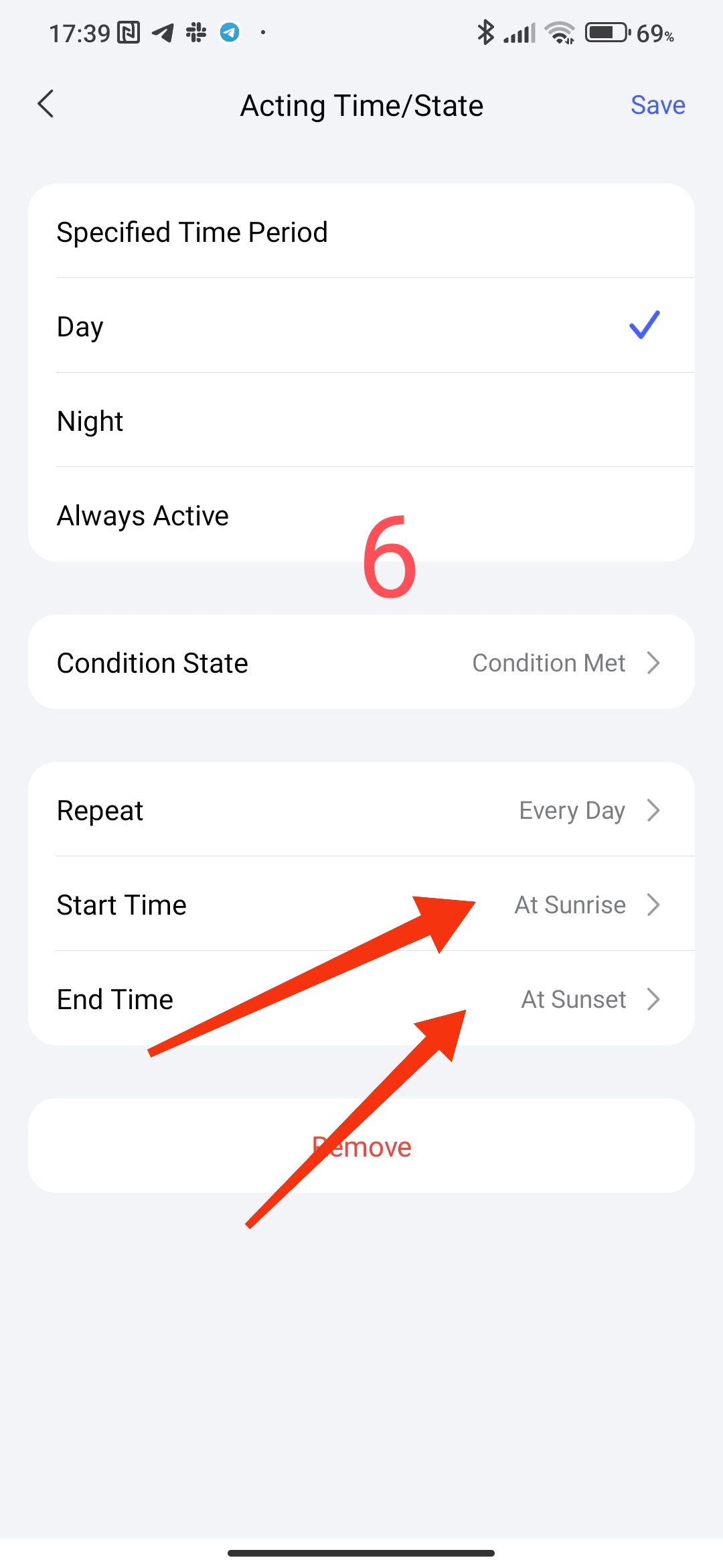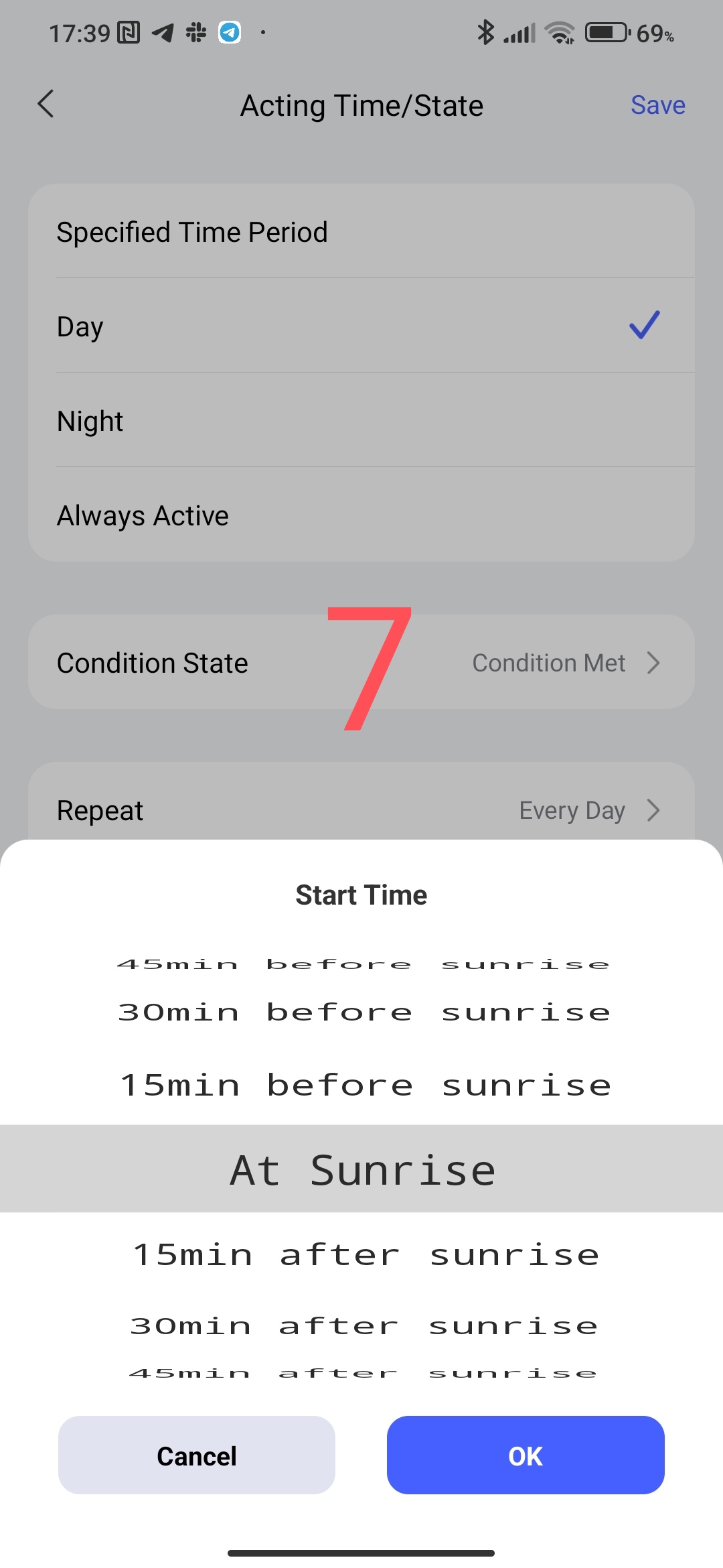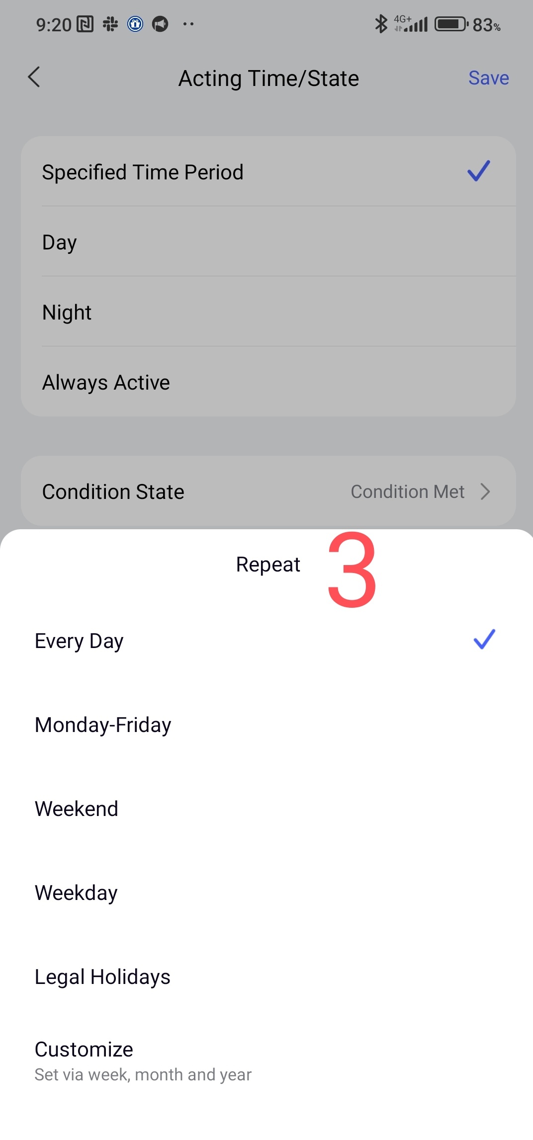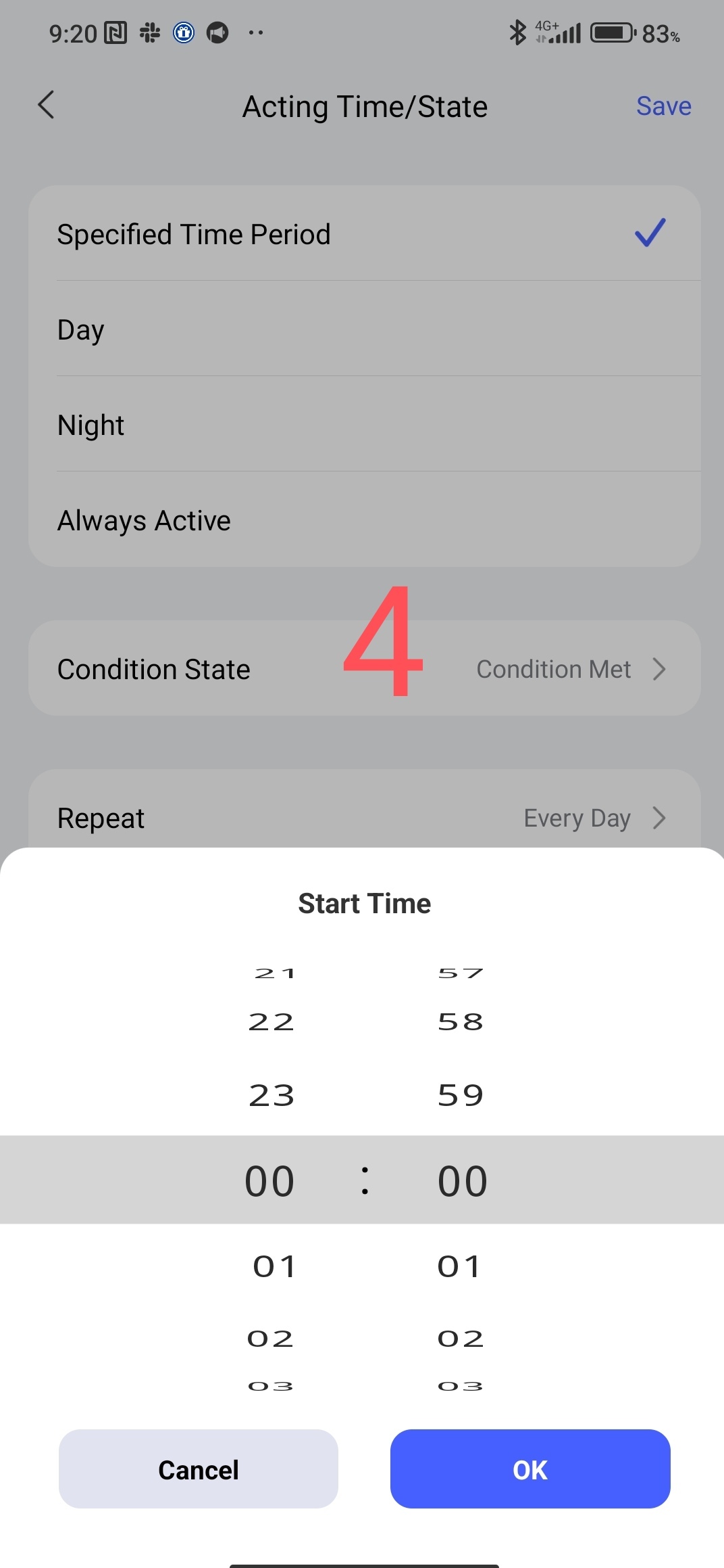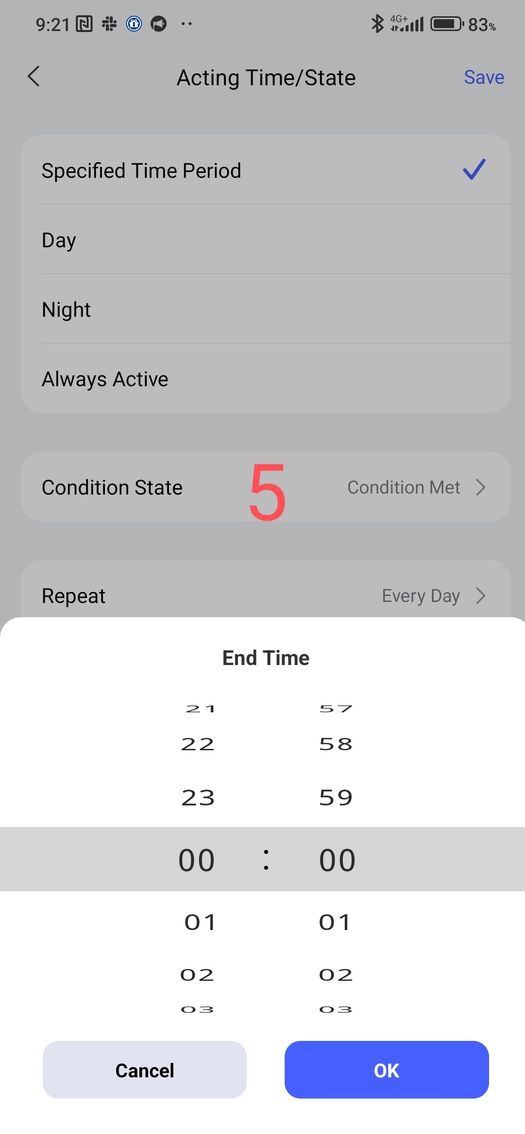 allows you to set the start and end time of the action within 24 hours (3,4) and set days/weeks/months (5).