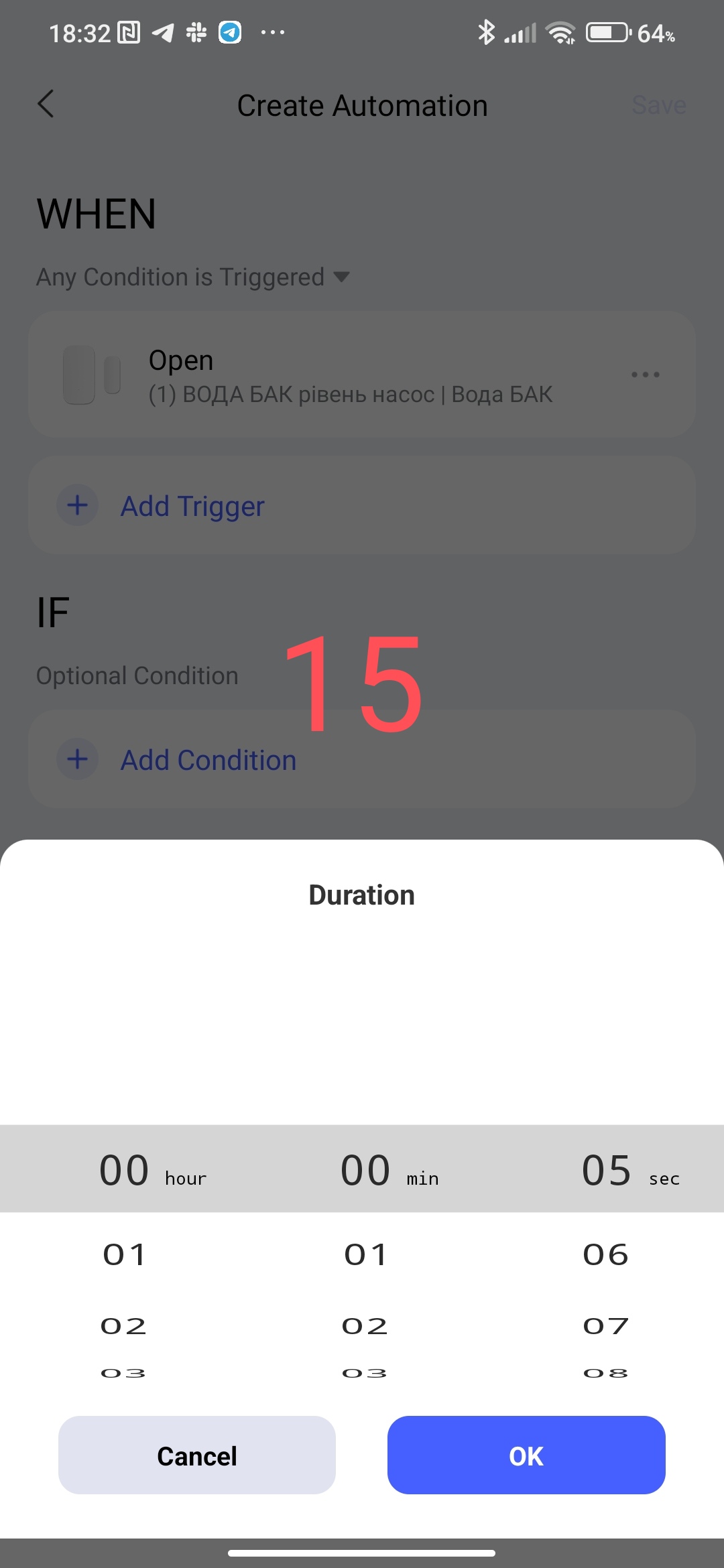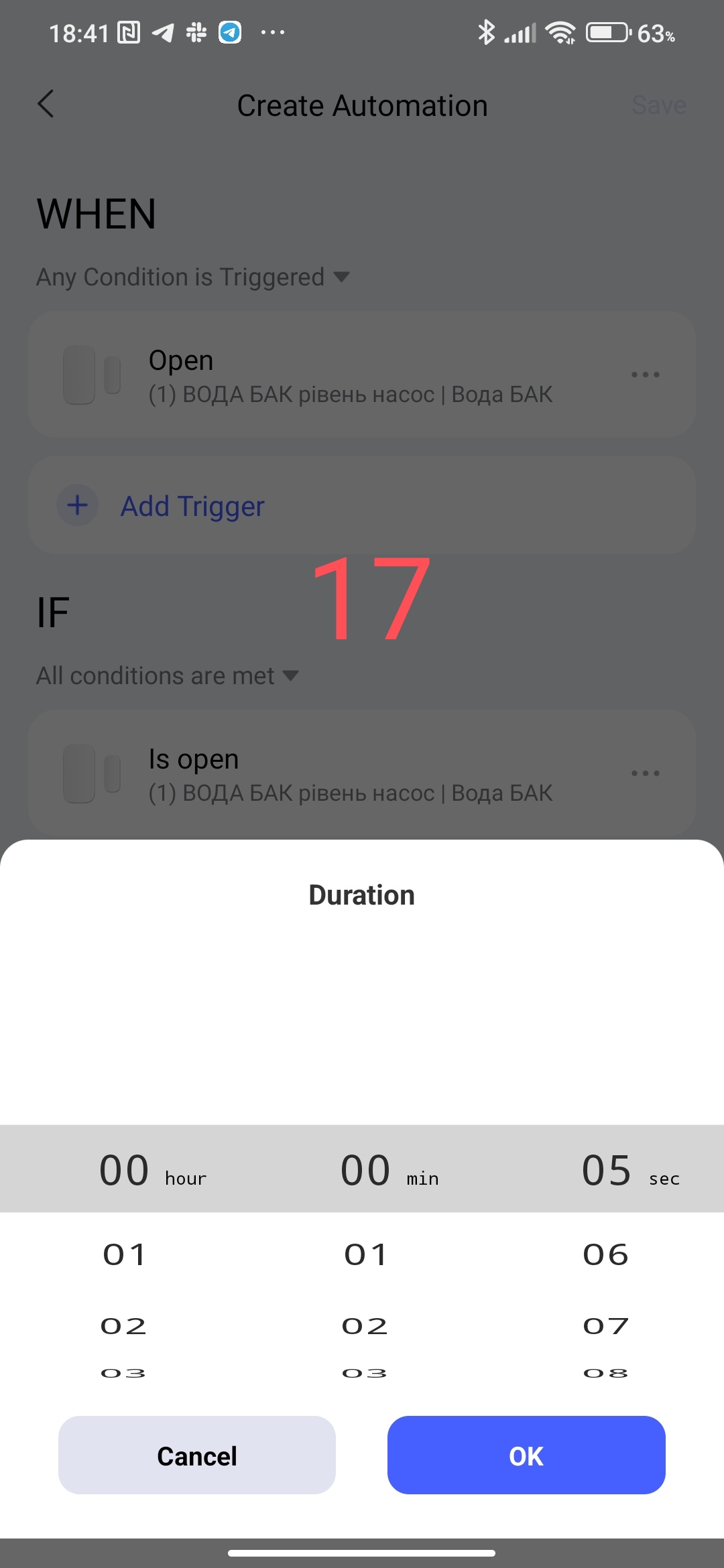 This setting allows the user to set a delay for the condition that occurred. Example - there was movement (motion sensor) after this there is a delay (set by the user) of the signal from the sensor and after this timeout, the following conditions are checked that are in the “IF” section. The delay time can be set from 5 seconds to 3 hours.
