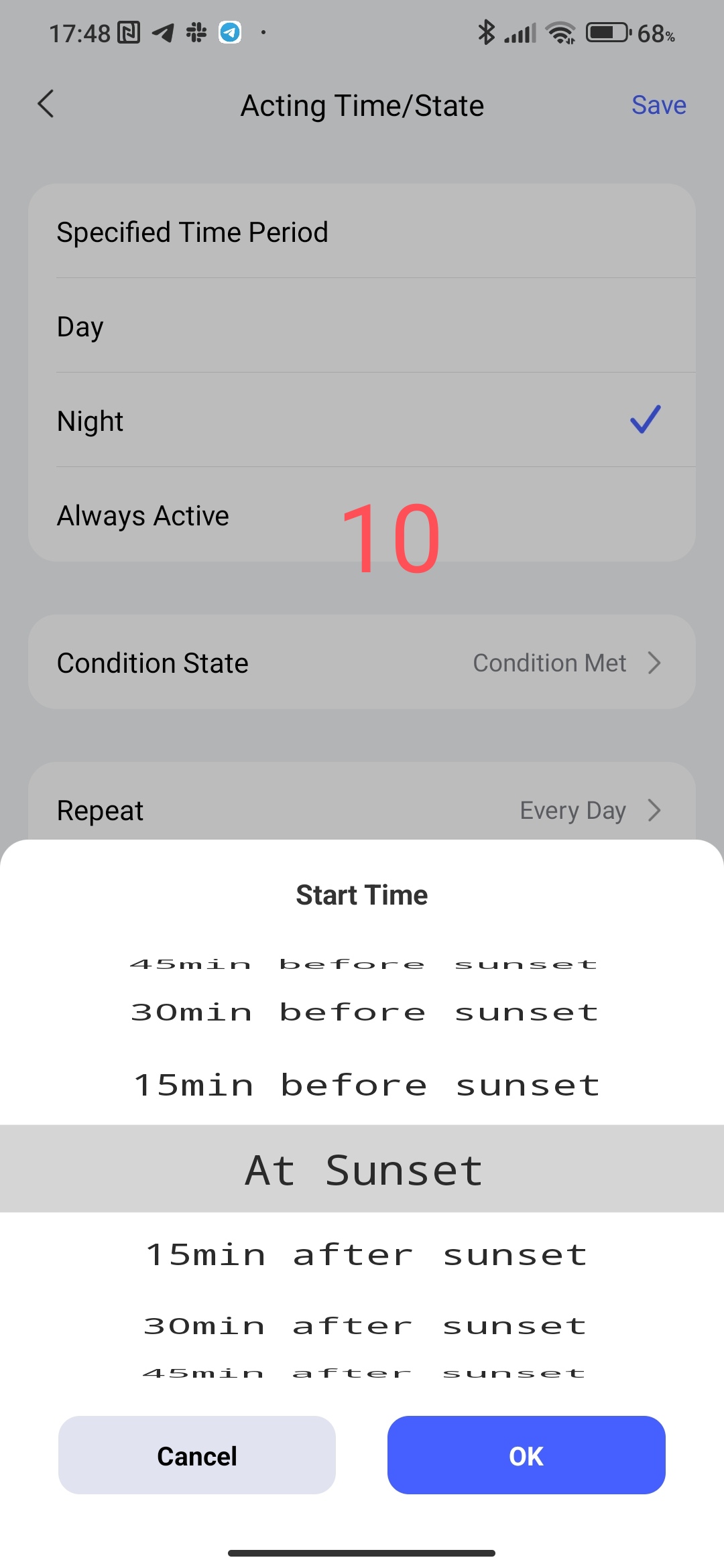 allows you to select the period “sunset”, “sunrise” (night time period). The parameter interval is quite extended from 15 minutes to 4 hours relative to the event (sunset, sunrise).