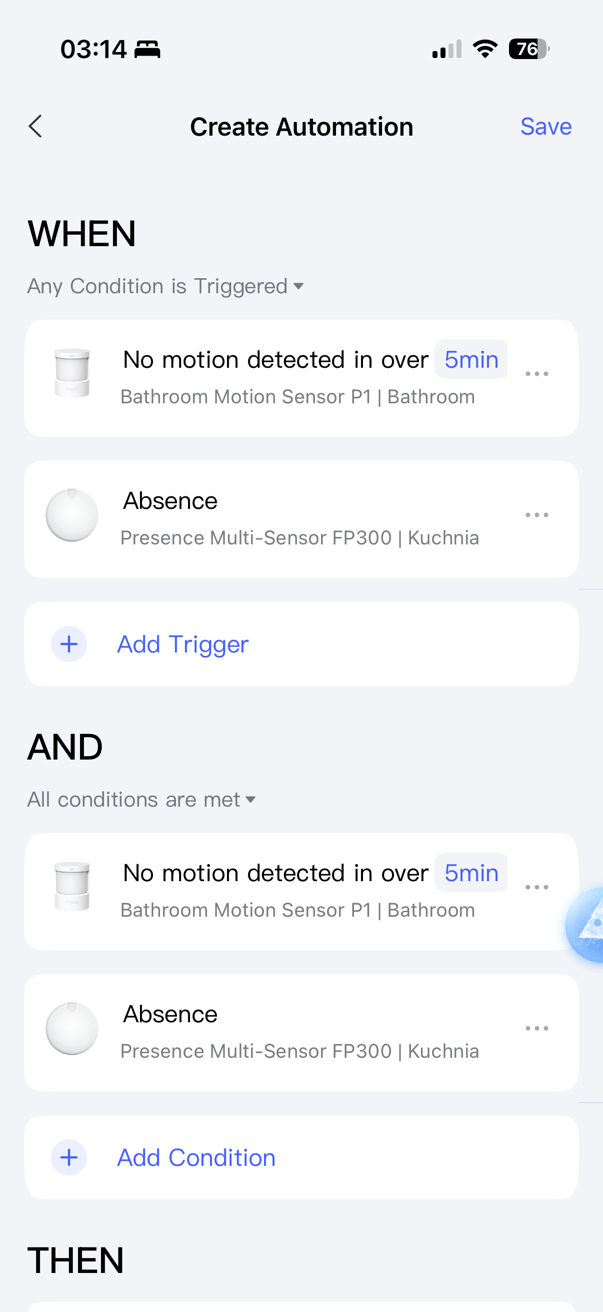 I’m trying to create a condition that if all my FP1E sensors sense no presence (absence) then turn off lights. I’m using them in my basement and need four of the FP1E sensors to cover the entire basement. But I only want the lights to turn off when all sensors show absence. I can’t do that with the automation engine. It only allows for ‘any’ condition or in sequence. Am I missing something?