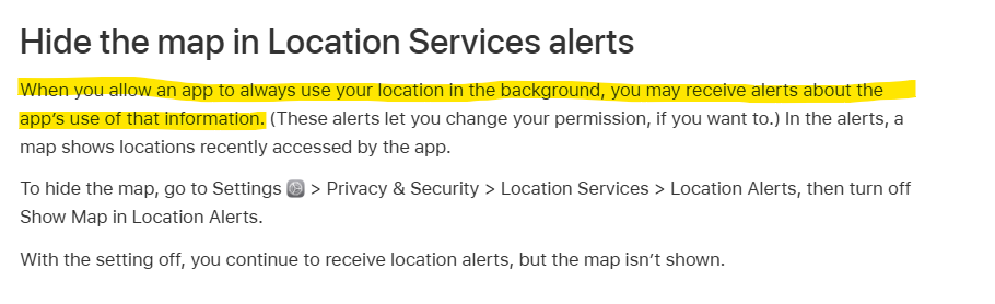 This issue is likely caused by the iOS “Location Summary” (or Location Alerts) feature. Even if you set the permission to “Always,” iOS periodically asks for re-confirmation if an app uses your location frequently in the background.