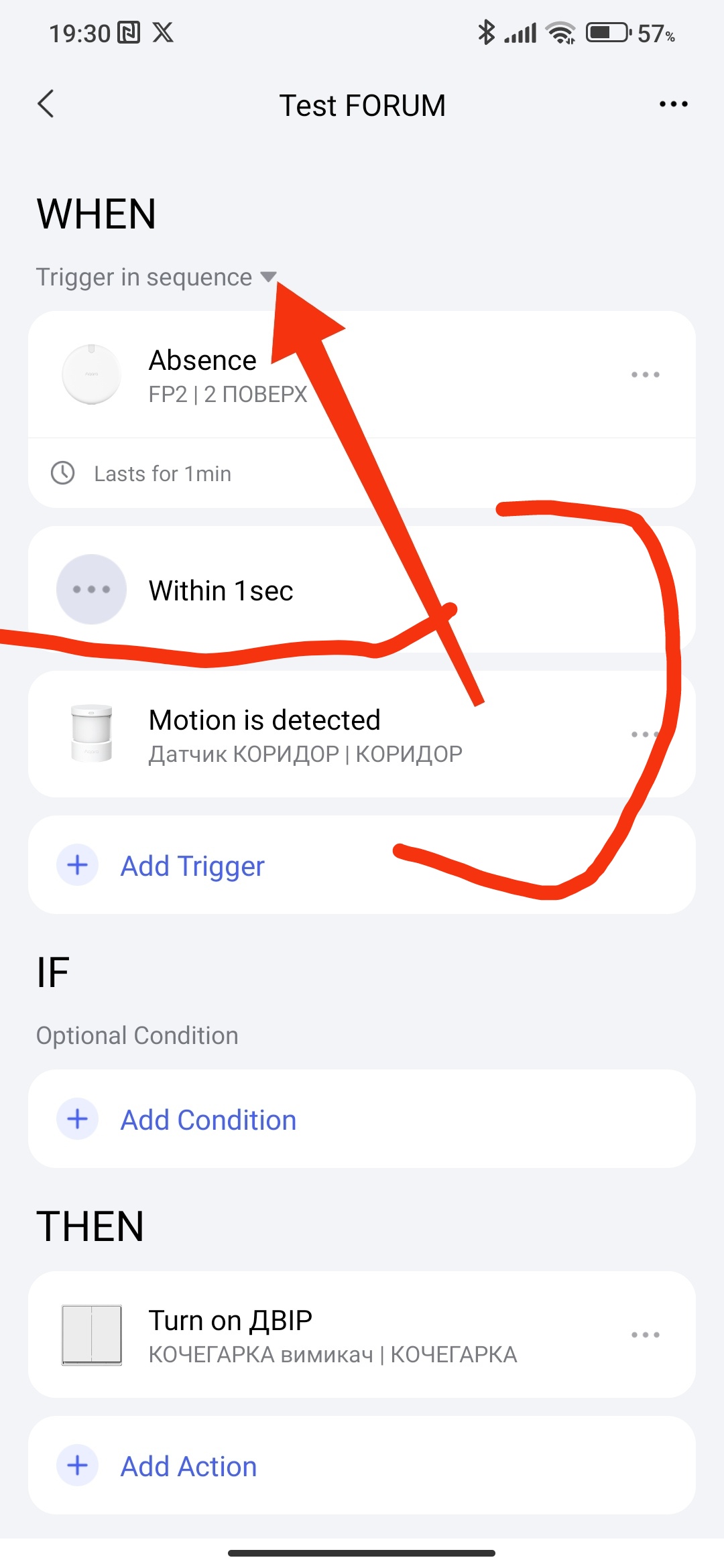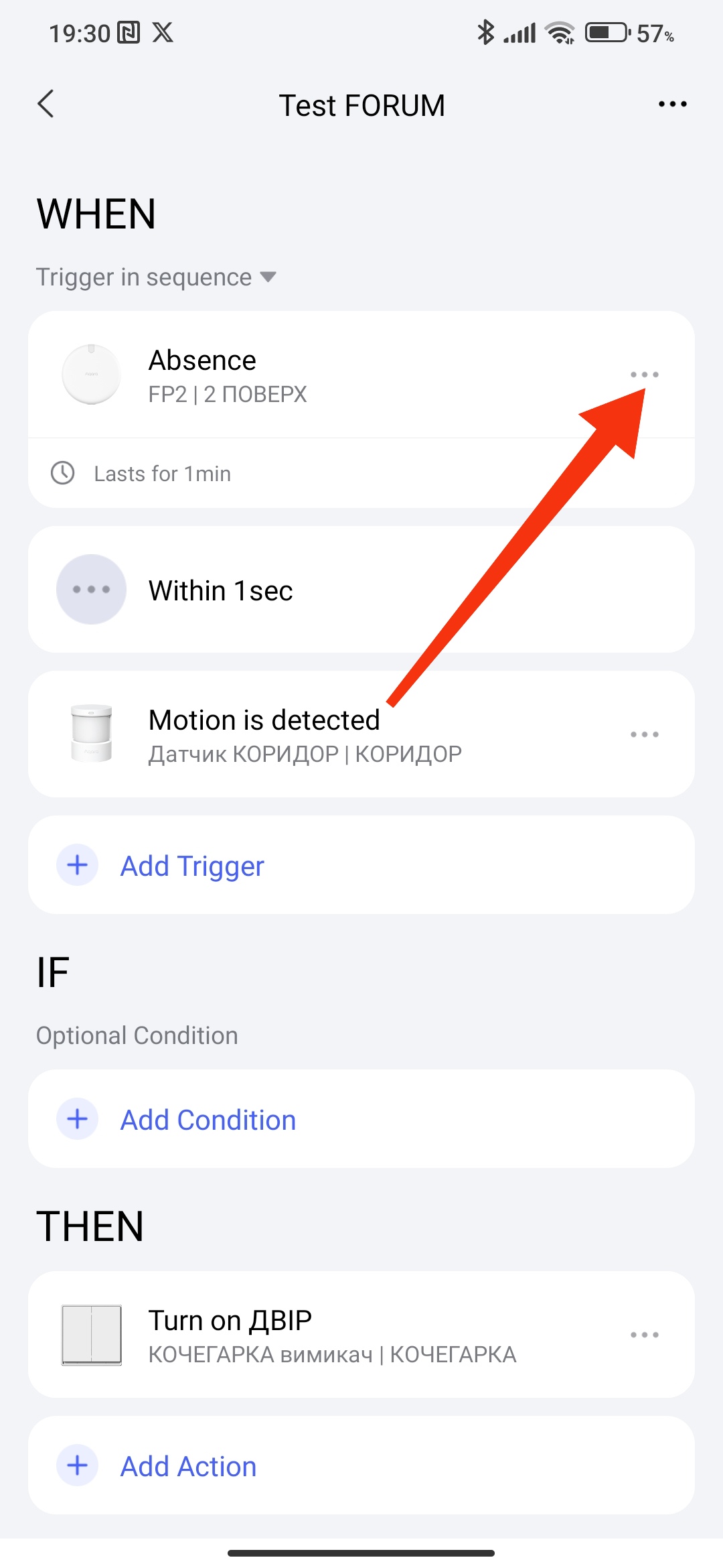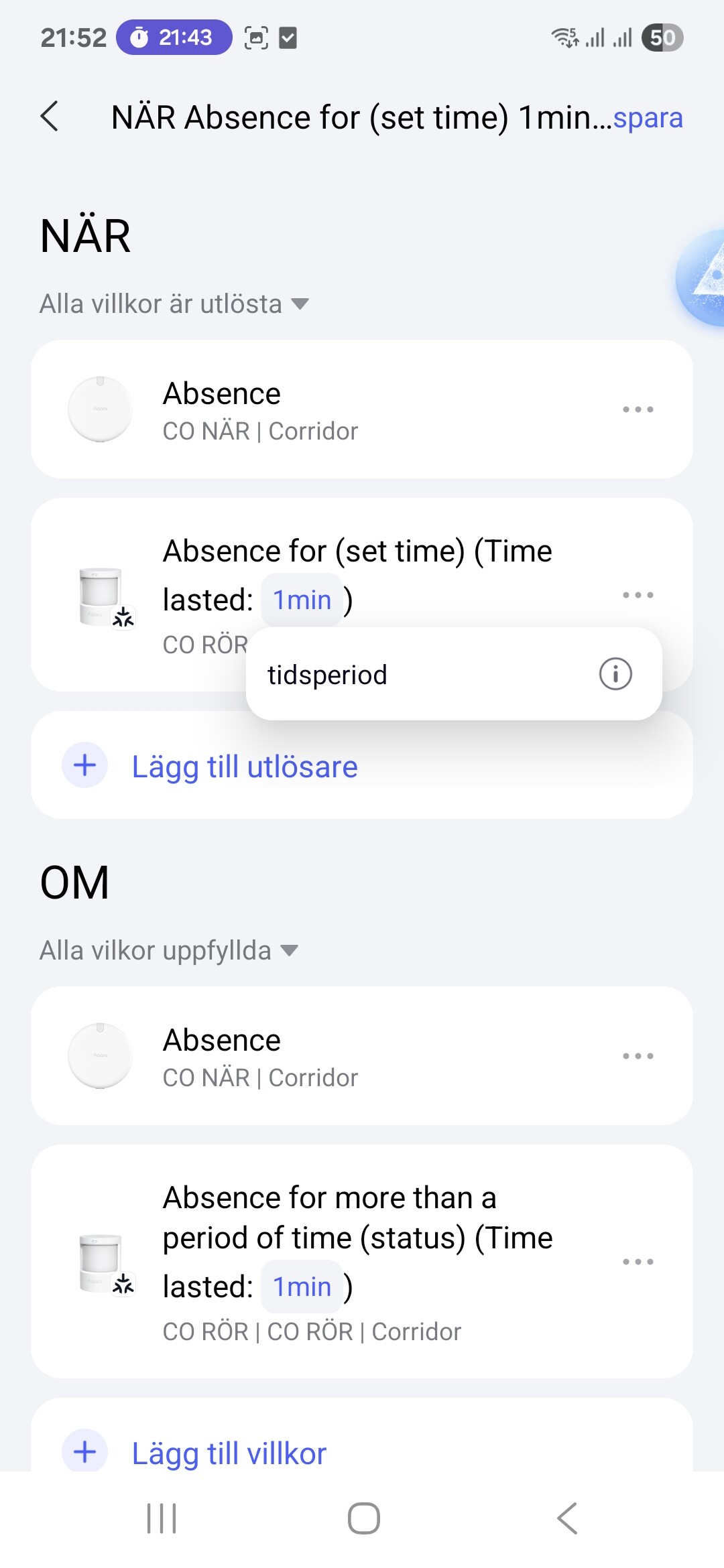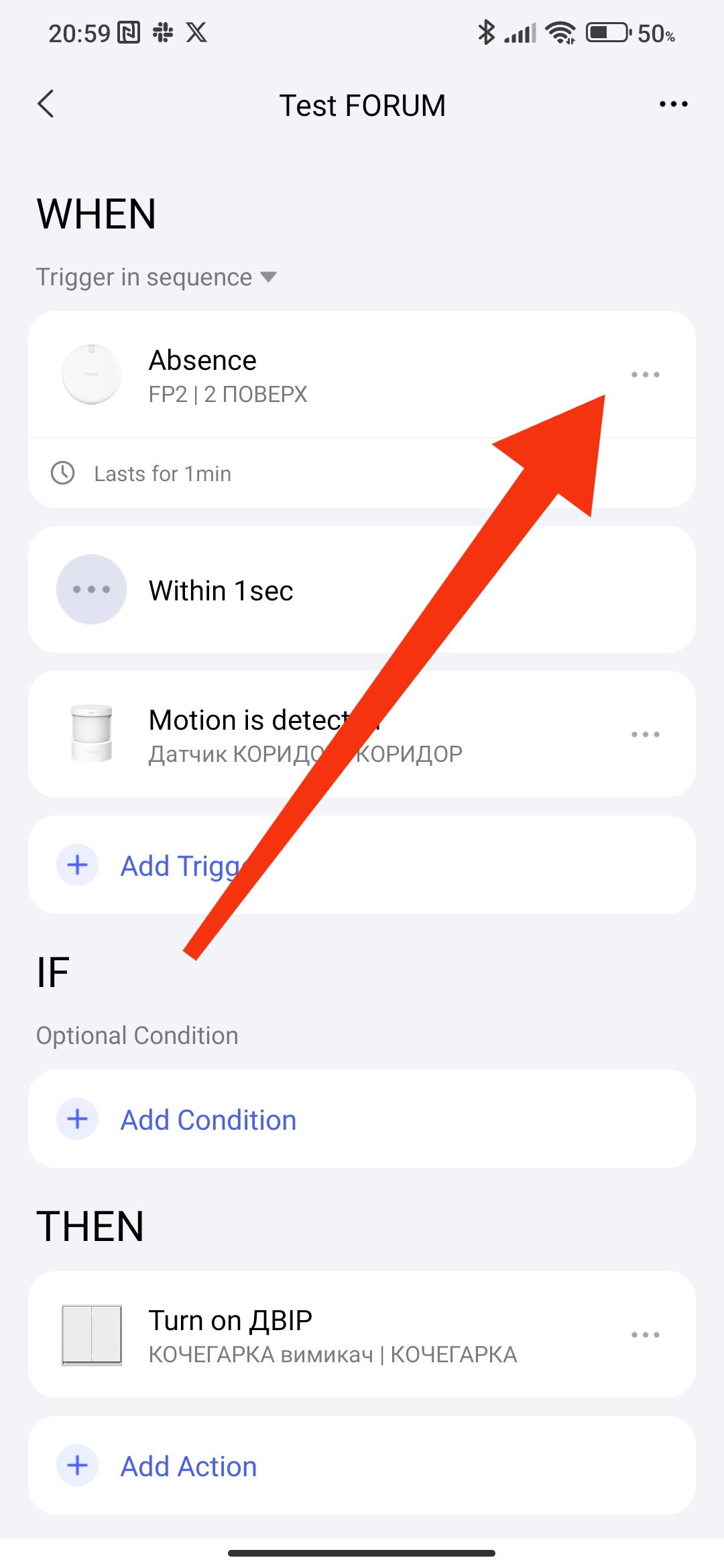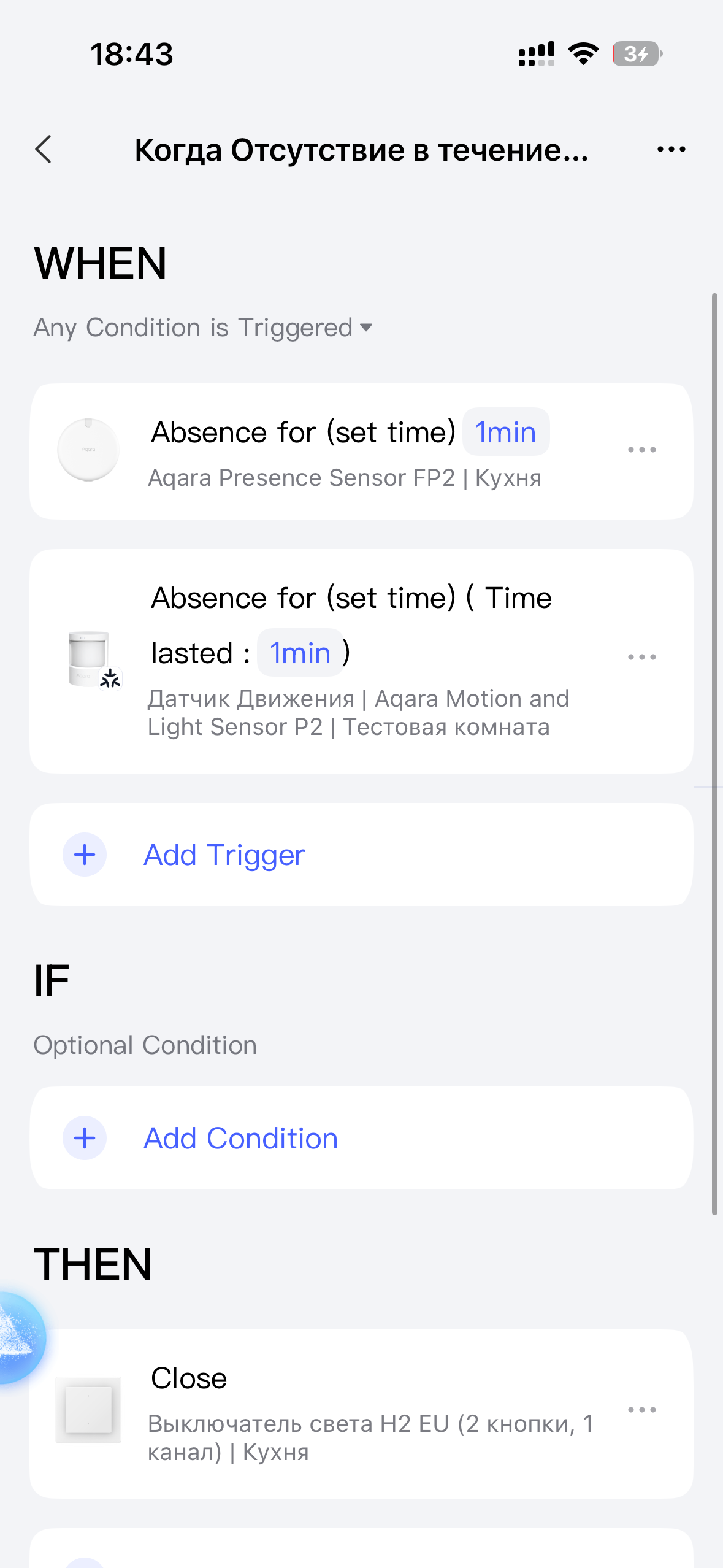 Hello, this is how it is done. Explanation, if there is no movement, we delay 1 minute, then 1 second for the period of triggering the next event (we can set a longer time) and check the condition for movement. My lesson 2, where I explain this. Automation 2.0. Lesson2. Advanced settings "..." (Execution time, delay of conditions, reversal of conditions) is