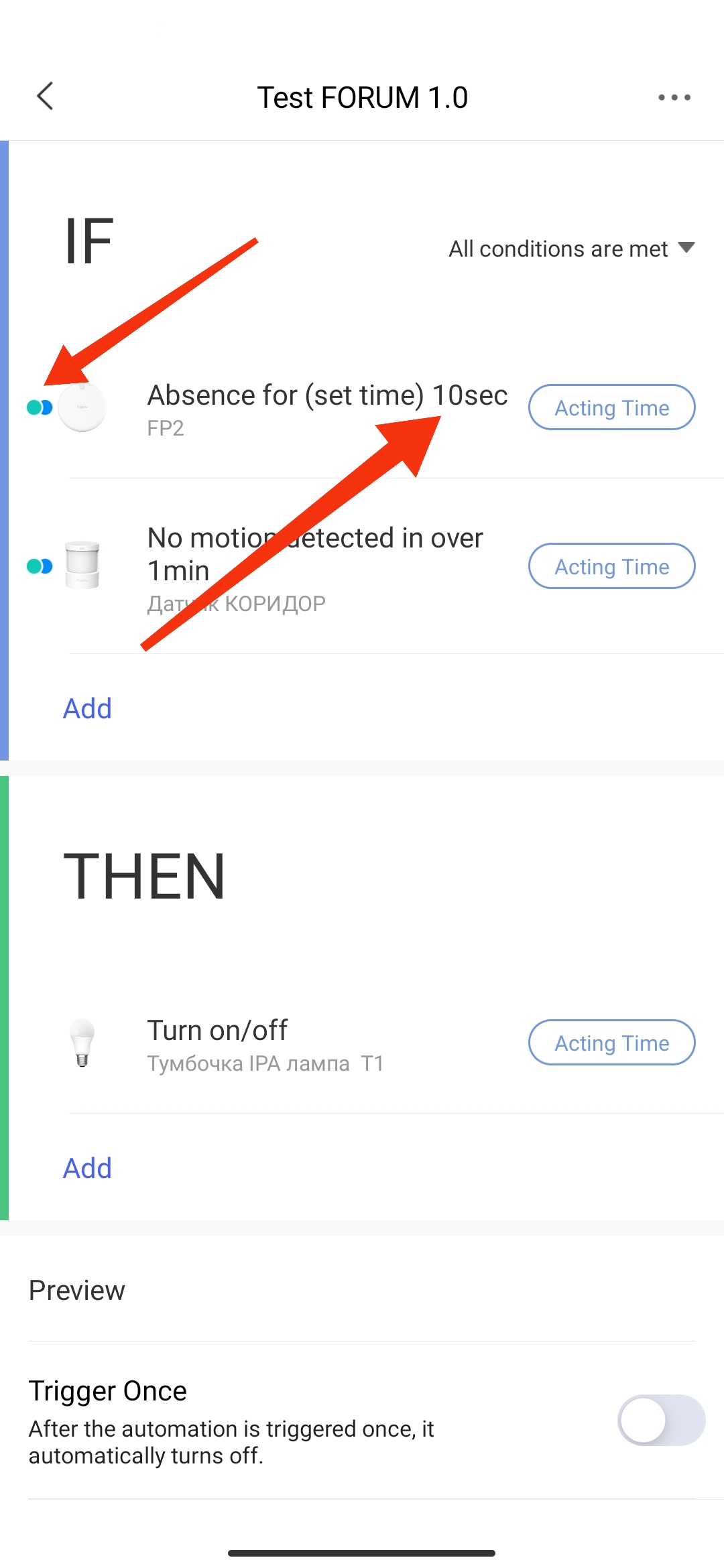 Hello, my recommendations, use automation 1.0 for your needs (tested by me, working version). Use in FP2 the option where the absence time is indicated (this is the condition with “°°” constant). Fig.