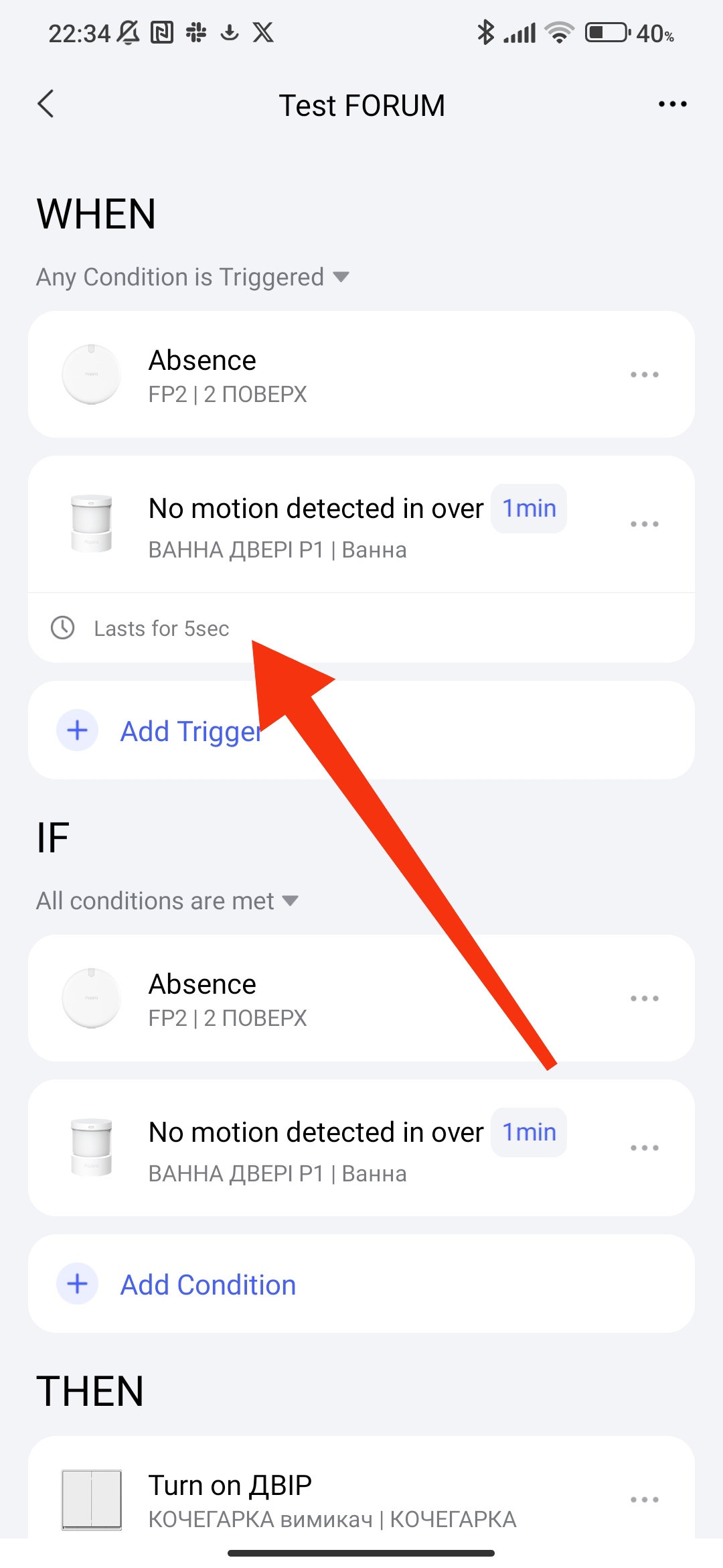Regarding “5 seconds”, this option is not available for all sensors (you have a matter motion sensor, I have Zigbee), check the operation without this setting (5 seconds). If it does not work, write here with a screenshot of the automation.