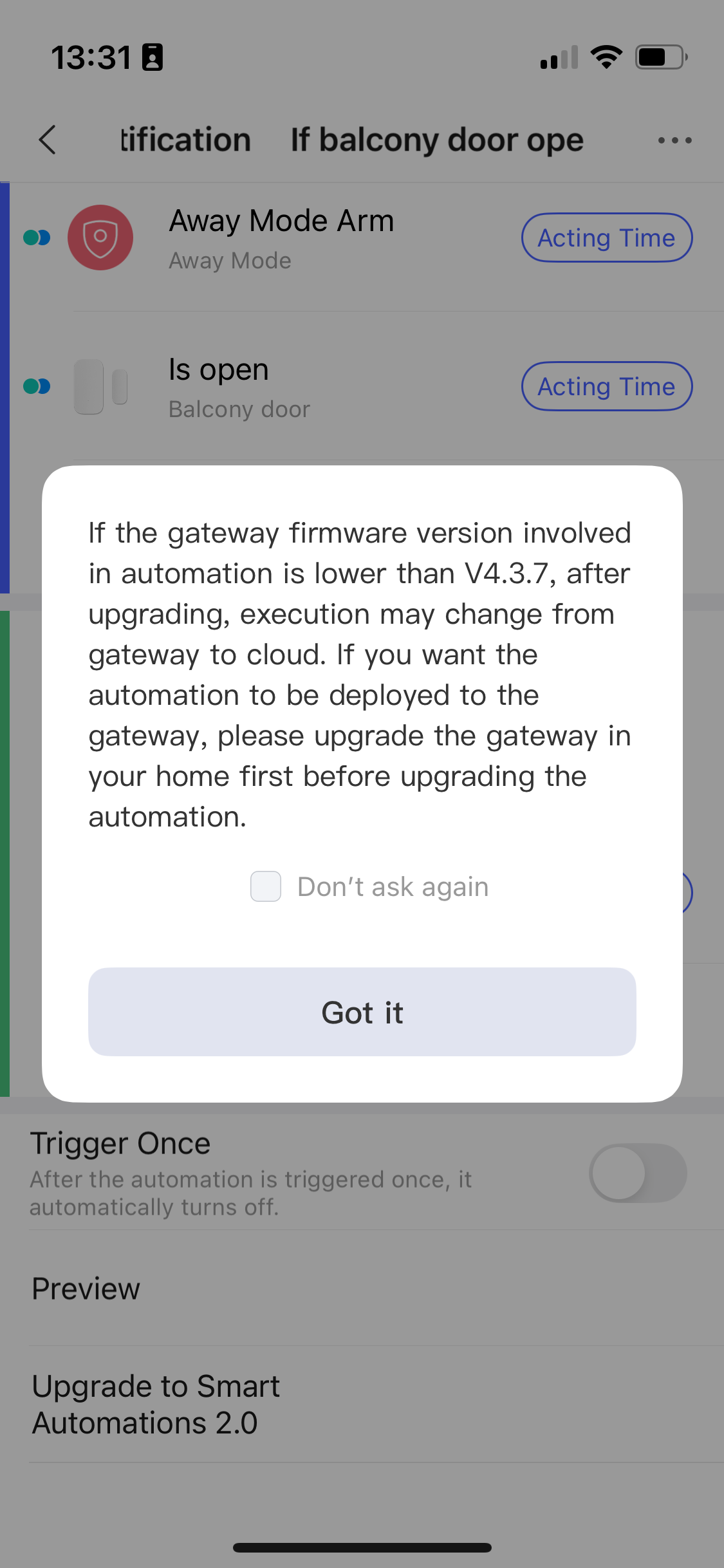 I also noticed automation 2.0 is now available in the general aqara app (v 6.0). I did get this warning? Can someone explain what is the ‘gateway’ in this case? And where can I find the firmware version? I’m guessing it is the firmware of my aqara hub, which is in this case the m3 and version 4.3.8xxx