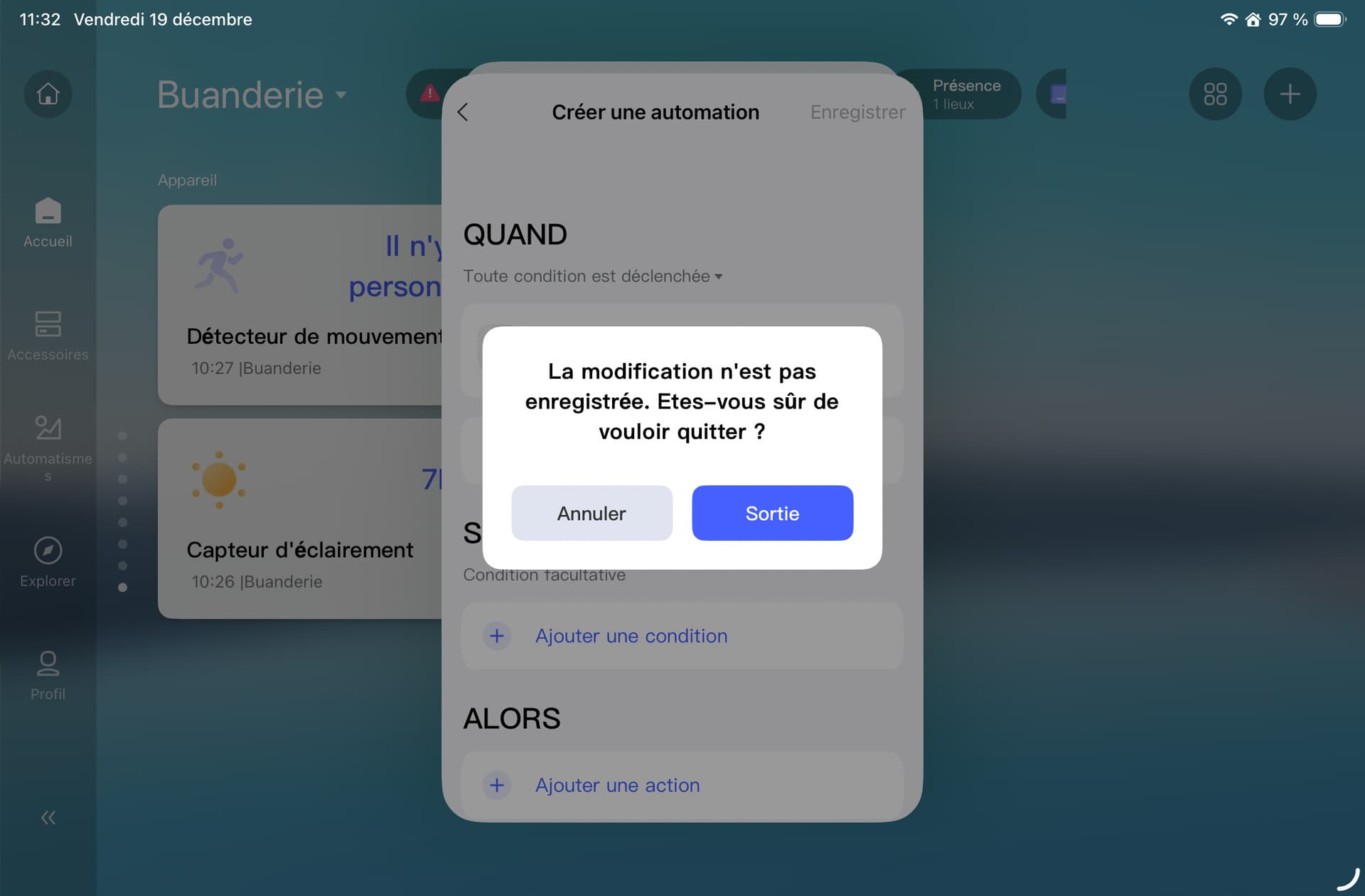 When I press the « Sortir » button, nothing happens, and I return to the automation.