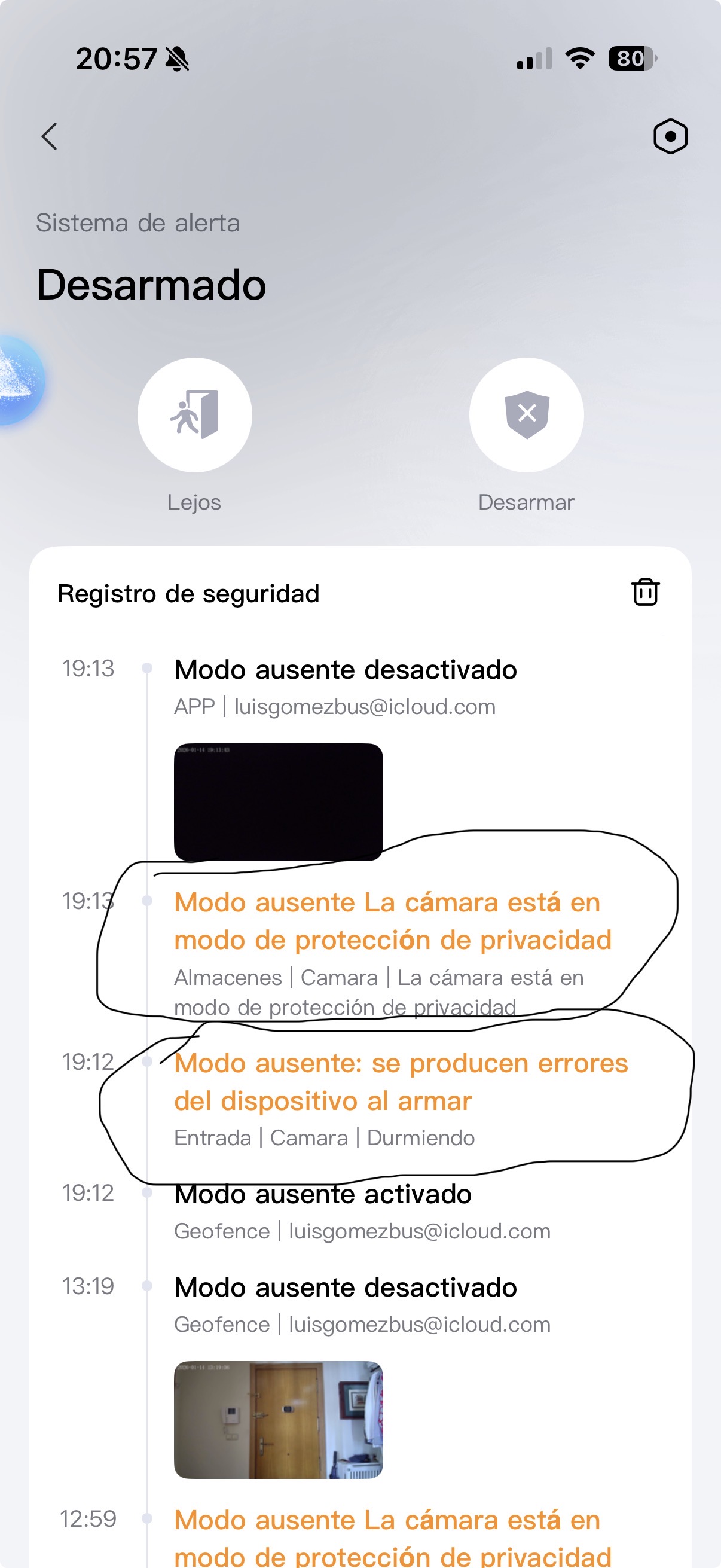Tengo configurada la camara para que se active el modo “ LEJOS” mediante geocerca cuando salgo de mi casa. El problema es que cuando se activa el modo me aparece un mensaje de error( adjunto captura).