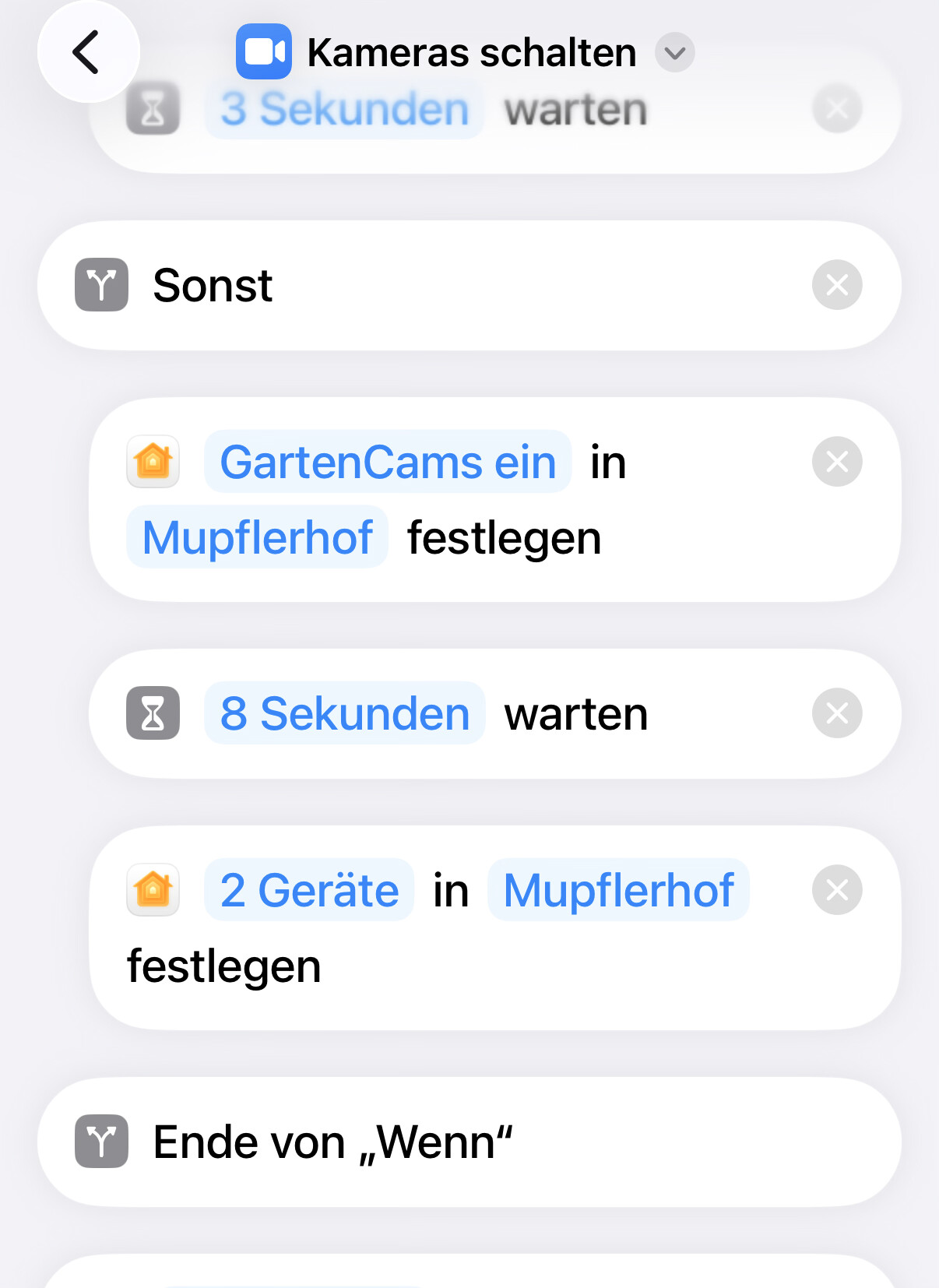 Here is an example how I solved this in Apple’s Shortcut app. First activate the two cameras, then waiting for 8 seconds and then activating the security mode.