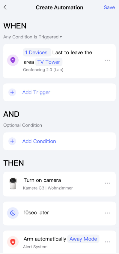 Por favor, intenta configurar la automatización para que, al salir del área de la geocerca (Geofence), también se encienda la cámara (o se despierte), tal como se muestra en la imagen.
