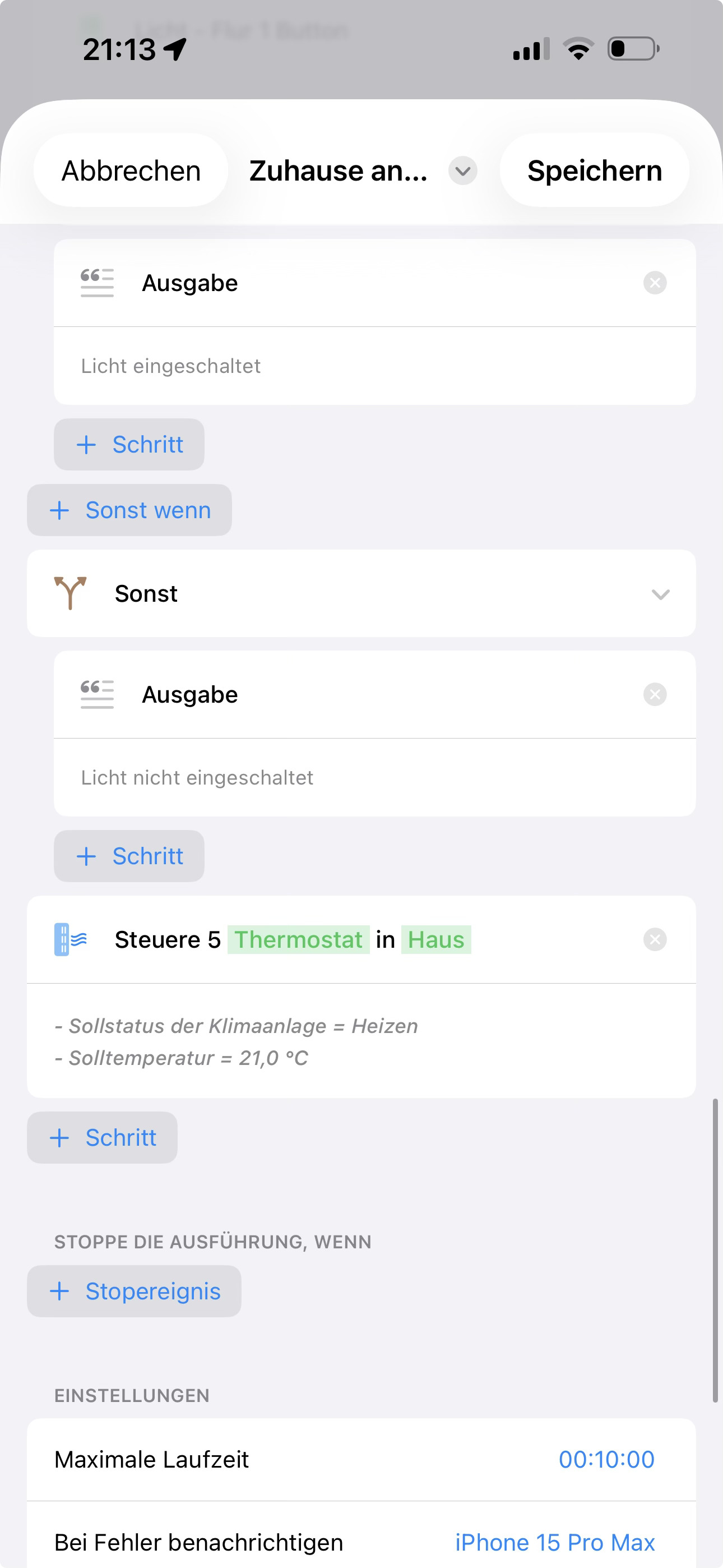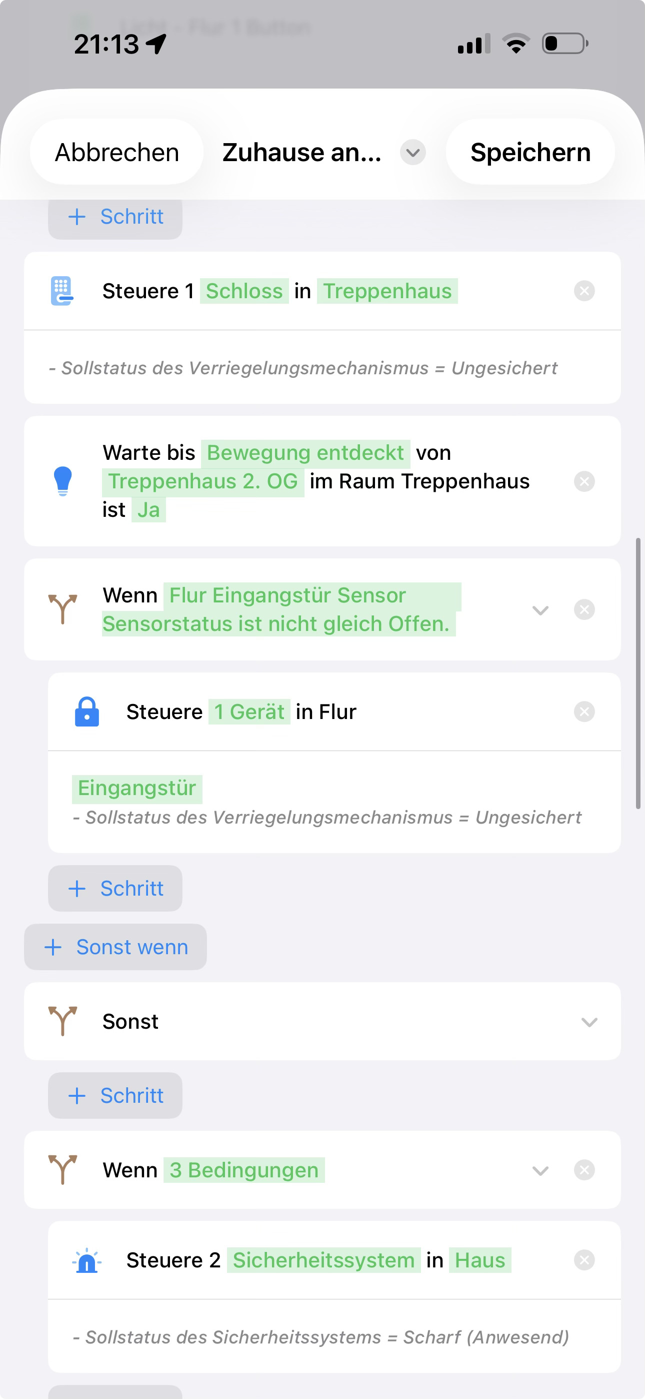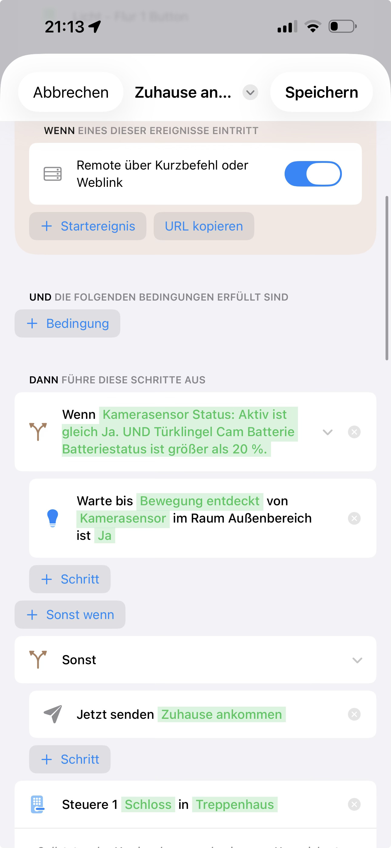The door only opens when one of us comes home and then the camera detects a movement within 10 minutes. If the time is exceeded, the workflow is canceled (for safety, for example, if you only drive past the house or something like that).