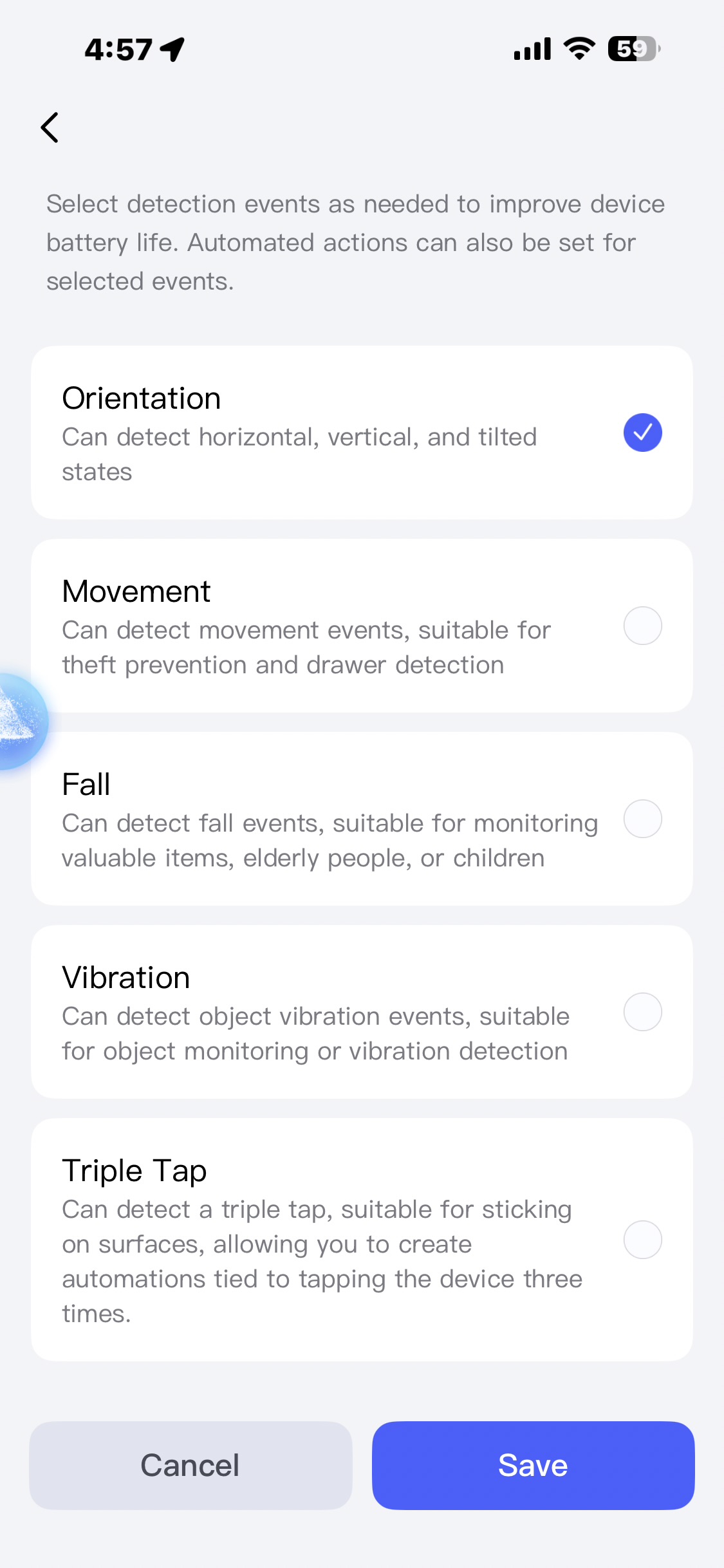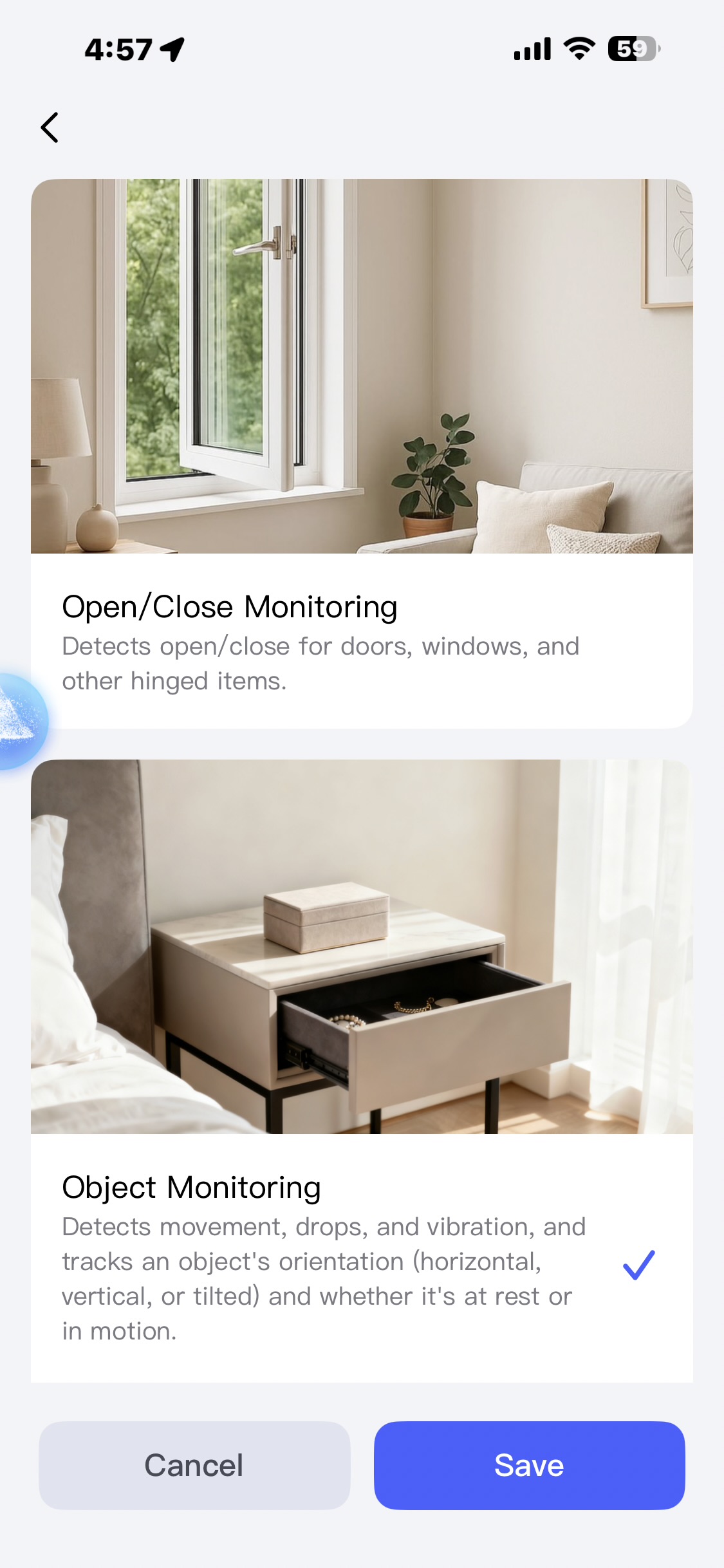 In my case, I specifically wanted to monitor opening and closing. I was especially impressed with the variety of door and window types available to choose from during setup. Selecting “hinged window” most closely matched the behavior of my ceiling TV mount, and it’s been working flawlessly.