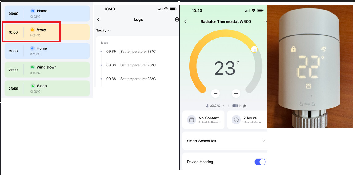 I already wrote that the smart schedules are not working as expected and I confirm it again. (At least for me). I decided to restart the valve once again and test it, but unfortunately the same result. I set the test away mode from 10:00 for 24 degrees and… nothing. There is no entry in the logs and the temperature of the valve is different, and so is that of the app. I guess we should wait for a new version of the firmware, because it is hardly up to settings. It should be user-friendly, not rocket science. If I find something I will write…