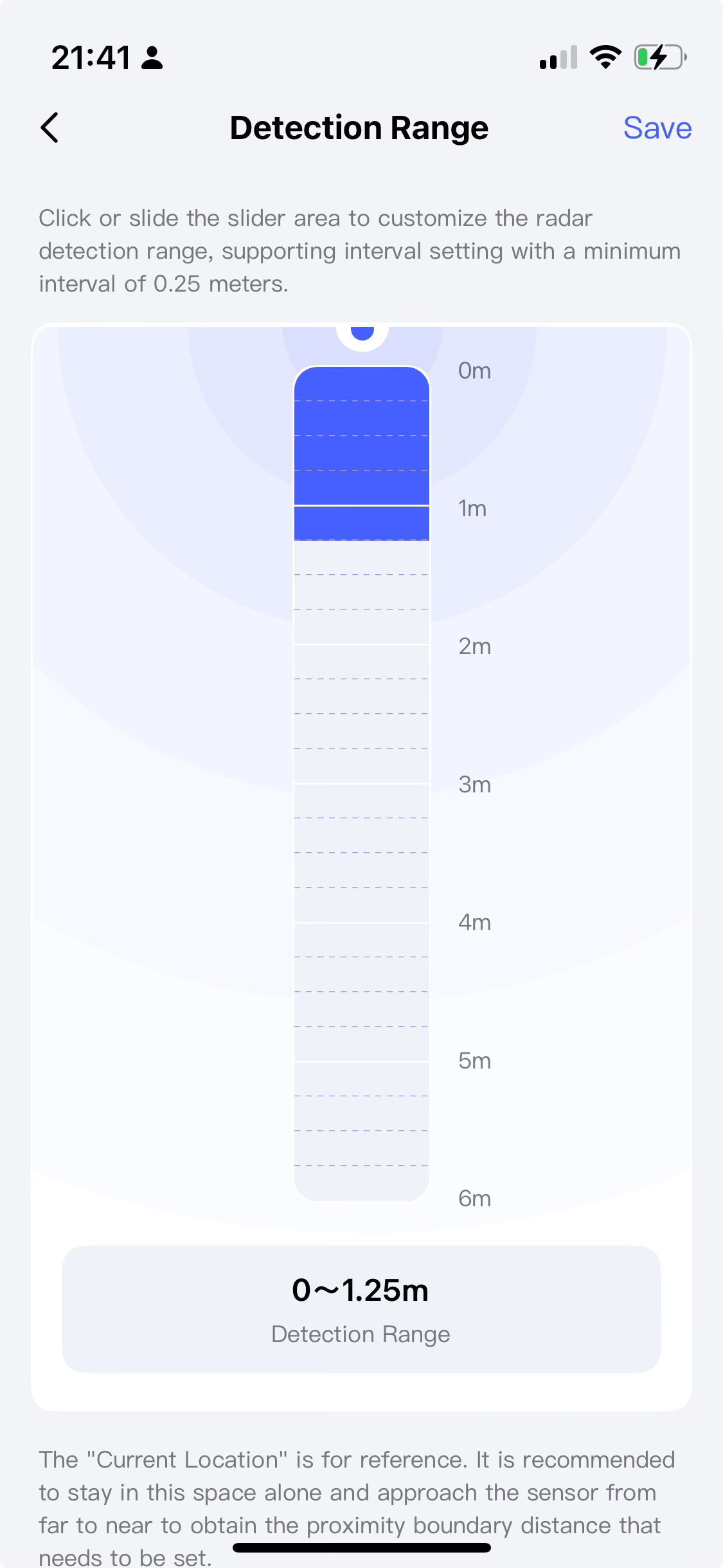 When I tried to configure the detection range in the configuration settings, I was standing in the middle of a room, 1 meter away and in front of the sensor, and yet the ‘current location’ does was not within the range but outside. Proper optimalisation of the settings can therefore not be done.