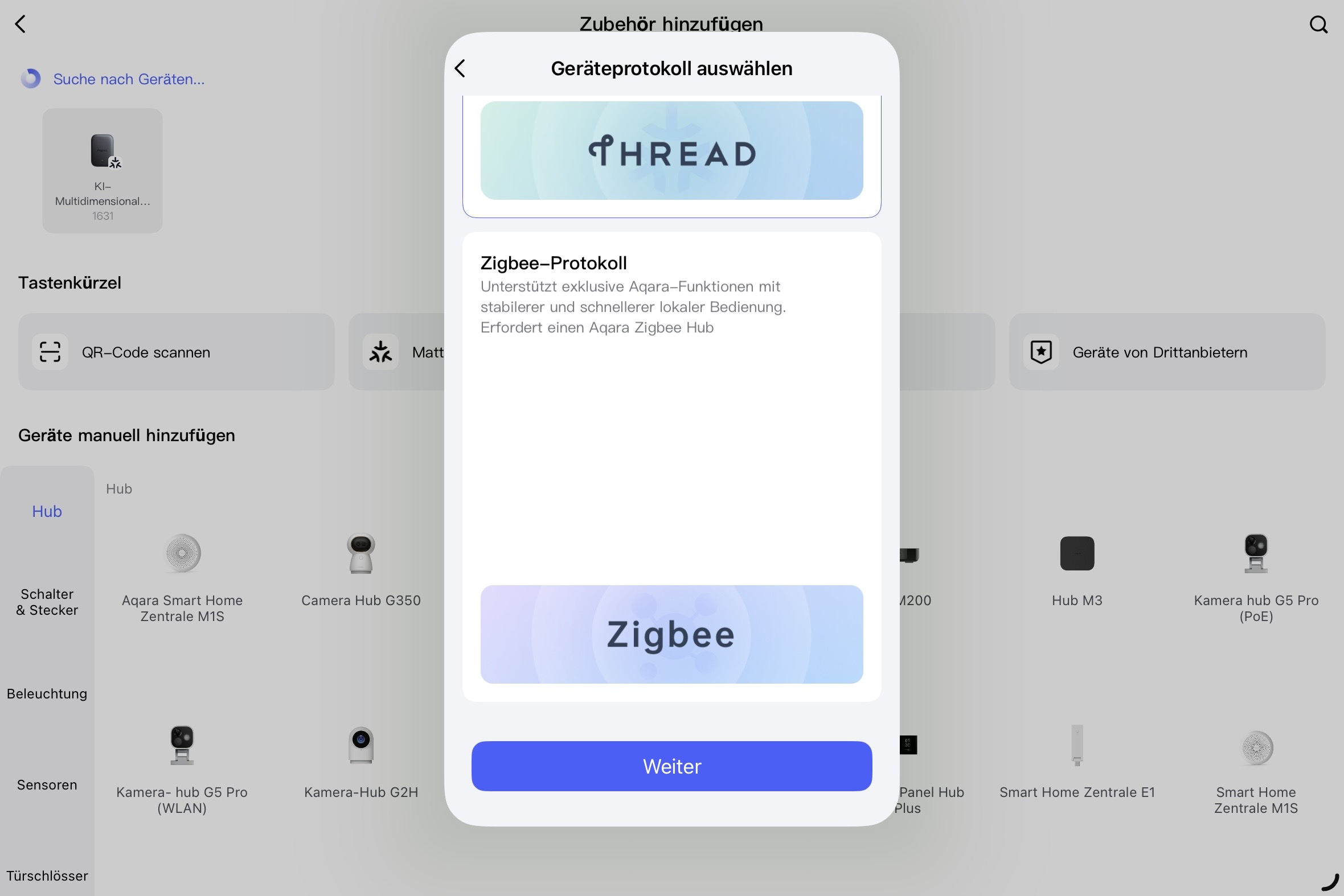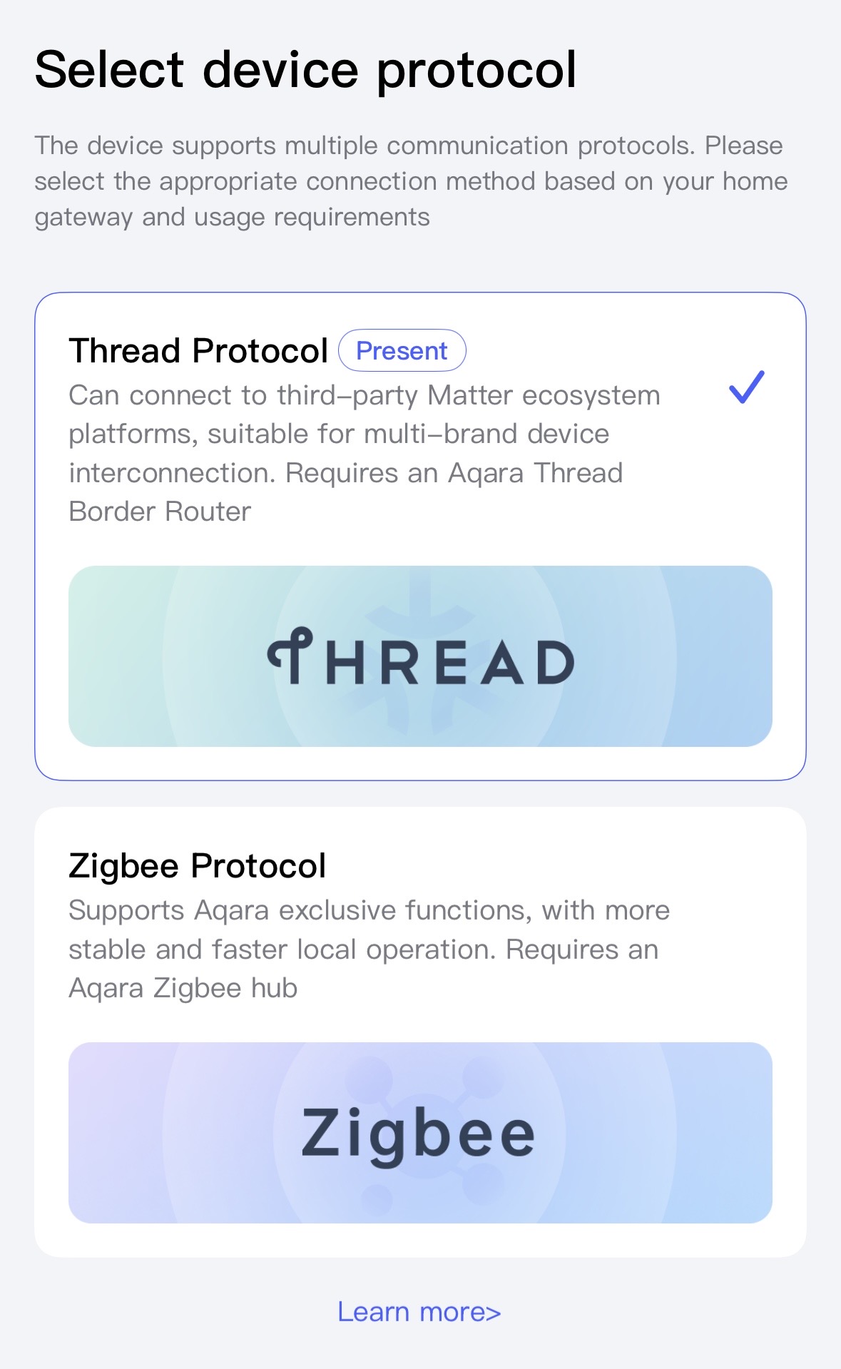 Note: Only the Aqara Hub M3 and Aqara Hub M200 are supported for connecting the Zigbee protocol during the early bird phase