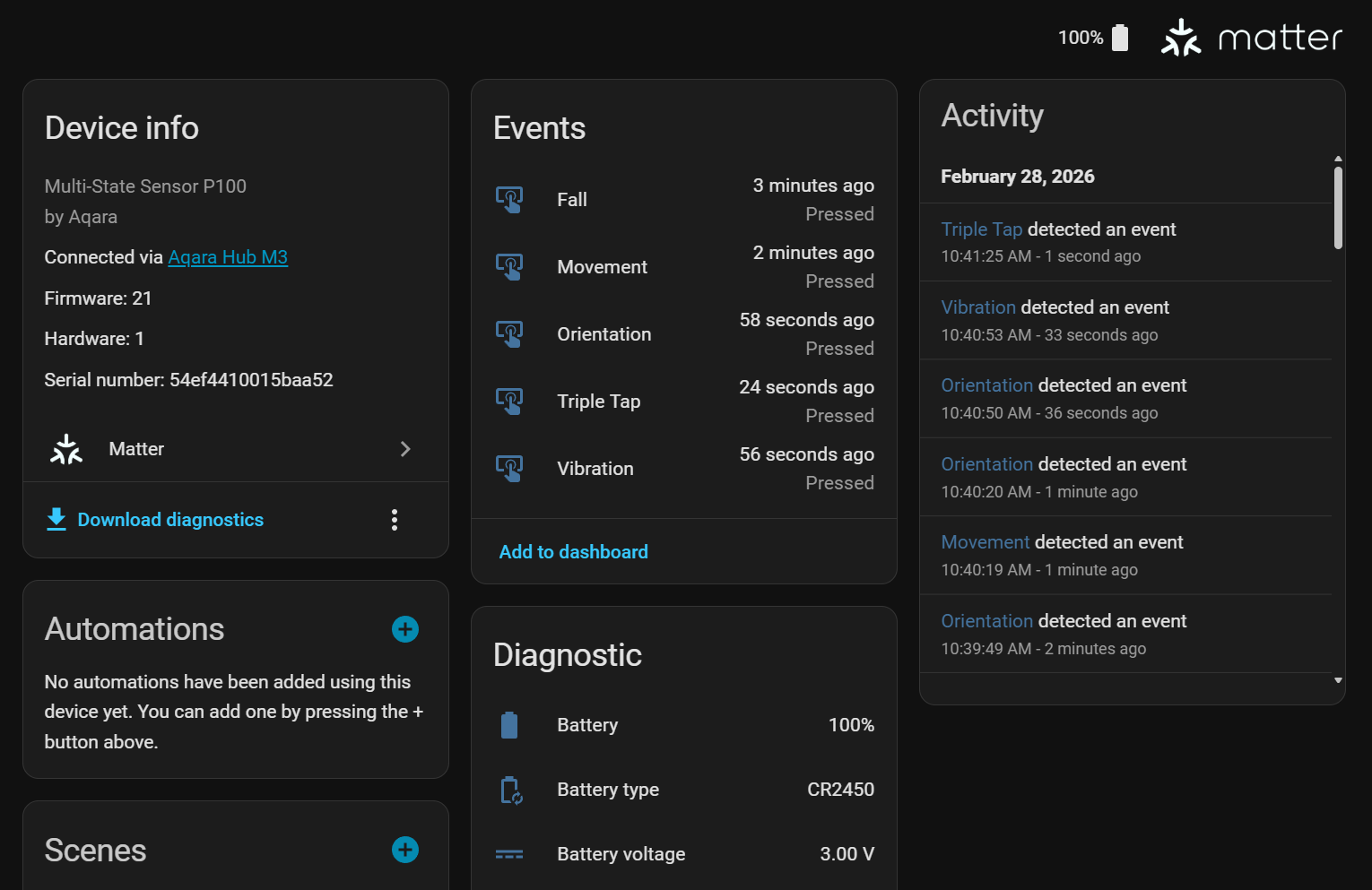 I have my P100 installed on my office chair, which helps to keep the lights on versus relying just on a PIR motion sensor. I have it paired via Zigbee to my Aqara M3 Hub, and then via Matter to Home Assistant. On the Home Assistant side, I had to rename the entities to properly reflect each of the P100’s detection capabilities.
