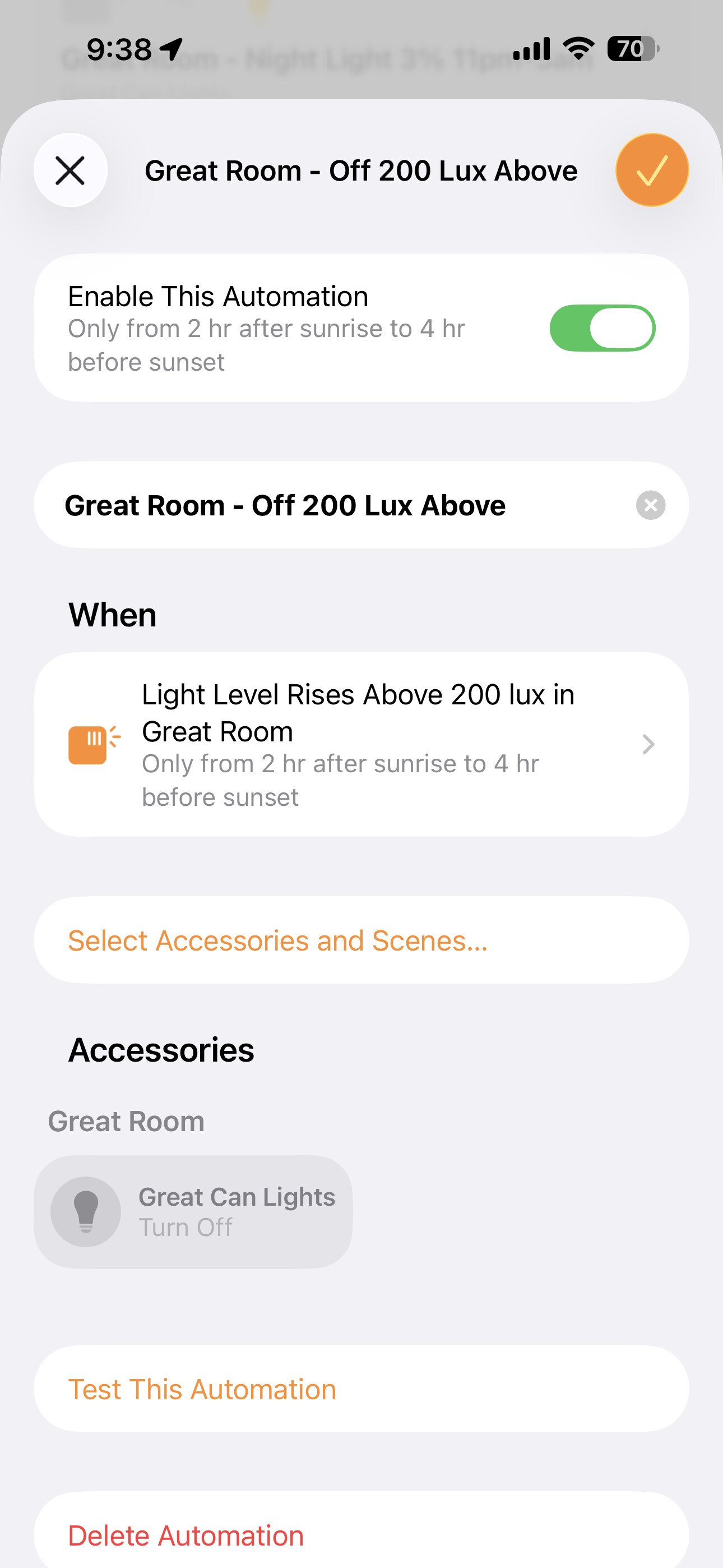 Light level rises above 200 Lux in Great room, then turn off great room lights.