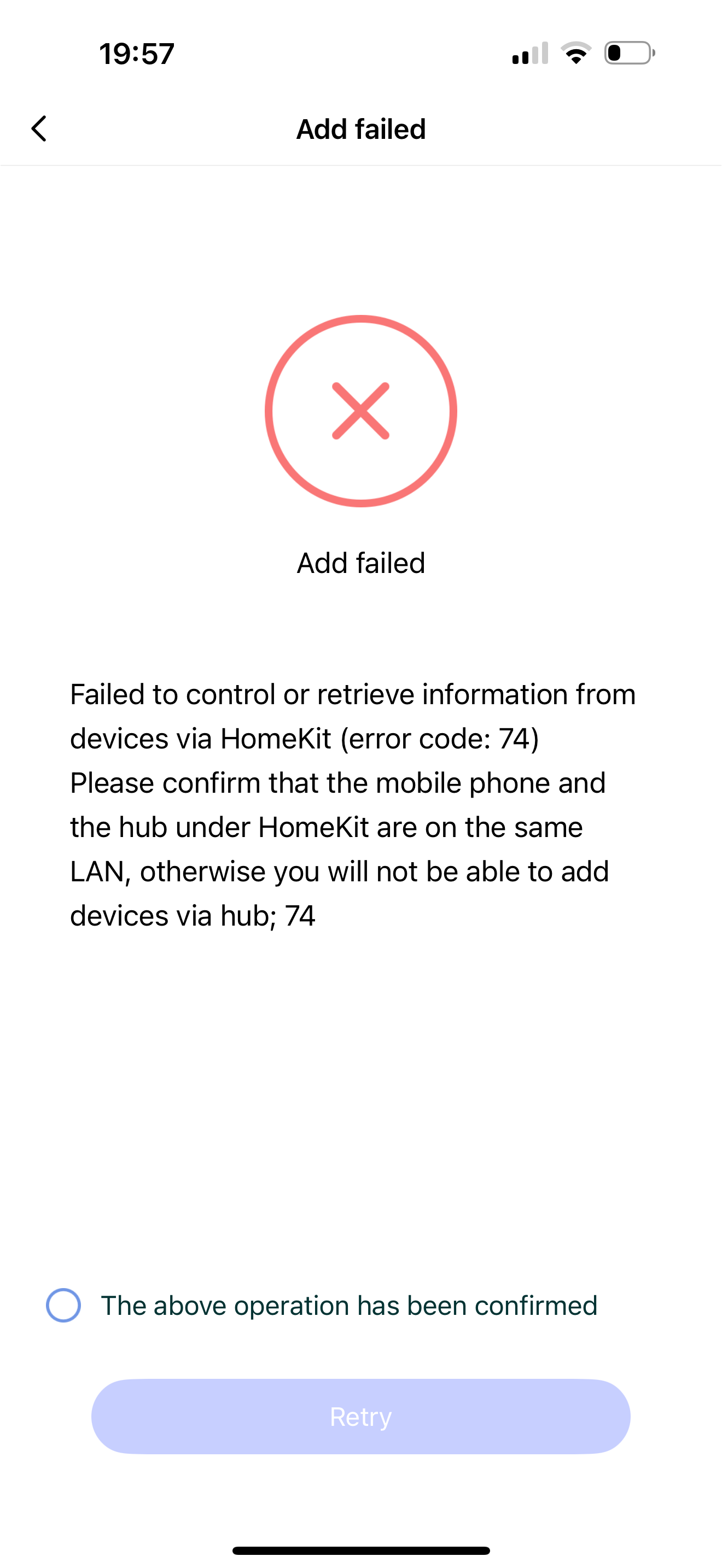My aqara g4 was running fine until this morning. I did a reset and removed the g4 from apple home and the aqara app. I readded the device and added it to apple home. That worked fine. The thing is that I cannot continue to add the g4 to the aqara app itself because of an error 74. (Screenshot)