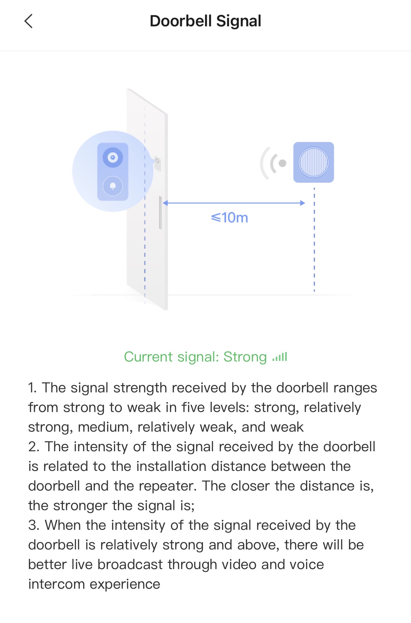 At all time signal is strong or good. DC12V 2A connected to G410 with battery as backup. So much easier then ring, with ring only AC24V then u will get the LED halo ring light up.