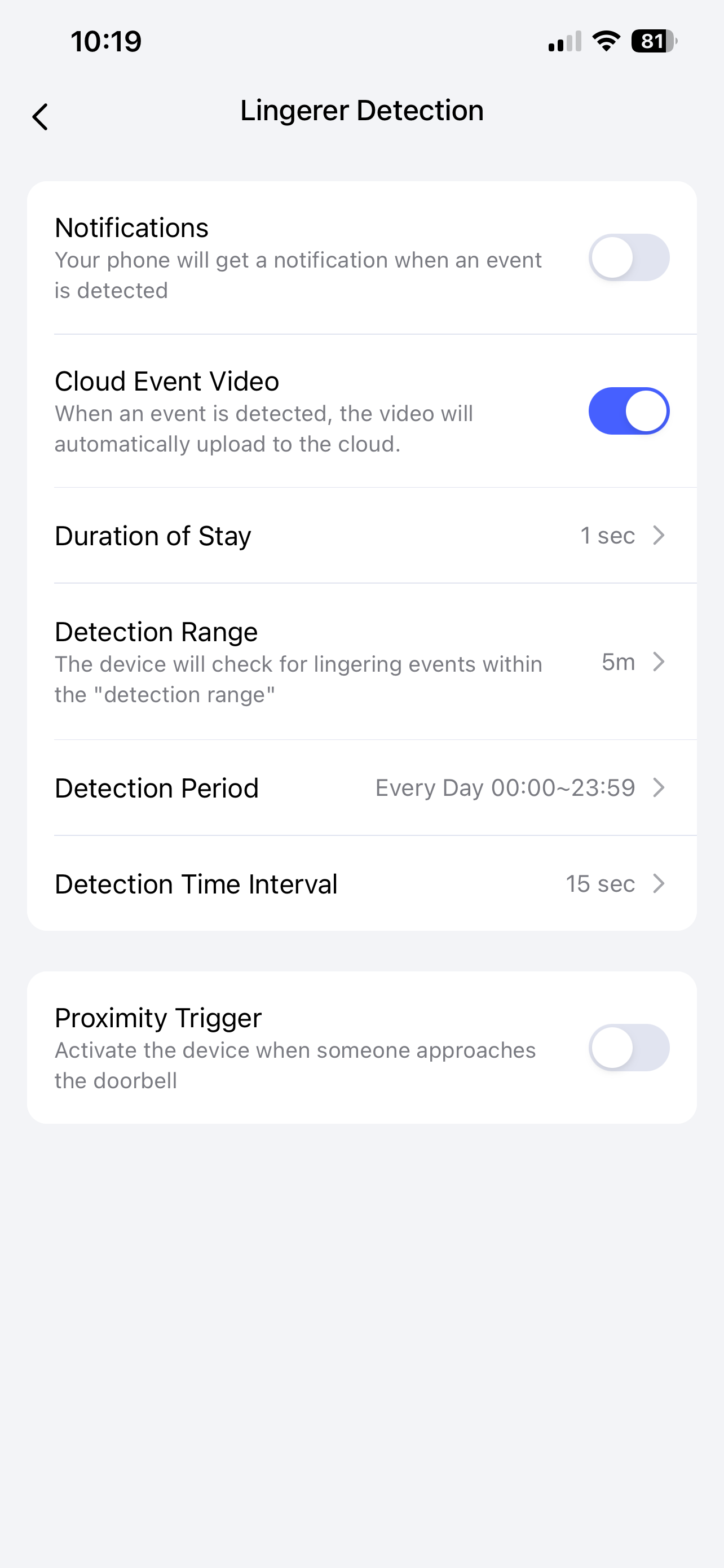Since you don’t have a cloud subscription, confirm that “Local Recording” is explicitly enabled for Lingering Detection (not just continuous recording). Go to Device Settings > Detection Settings > Lingering > Recording, and ensure the toggle is on and set to “Local” (if that option exists). Sometimes the app prioritizes cloud by default, but with no subscription, local needs manual confirmation.