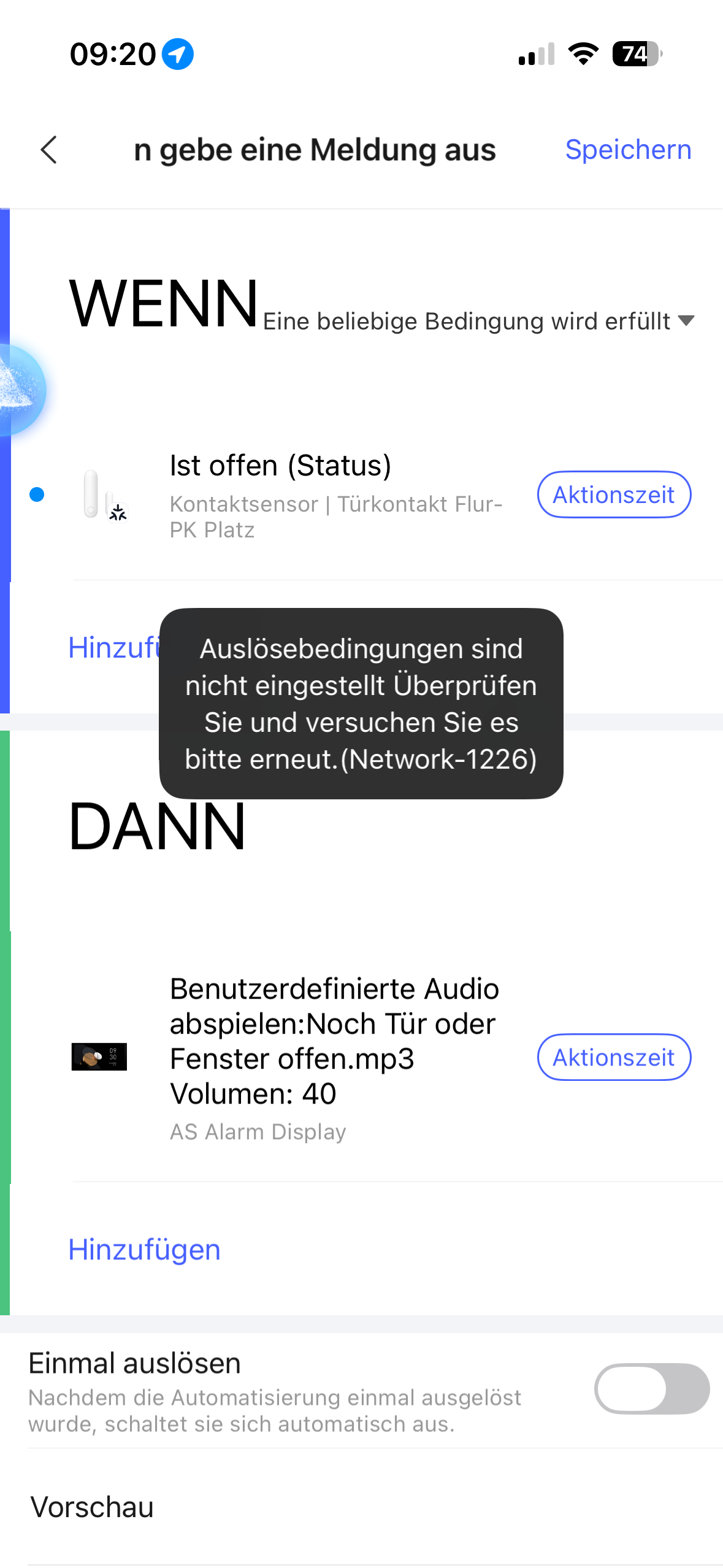 Versuchen Sie zur technischen Überprüfung, im WENN-Bereich anstelle von „Öffnen“ einen anderen Auslöser zu verwenden (z. B. „Schaltfläche“, „Ein“ oder etwas anderes).