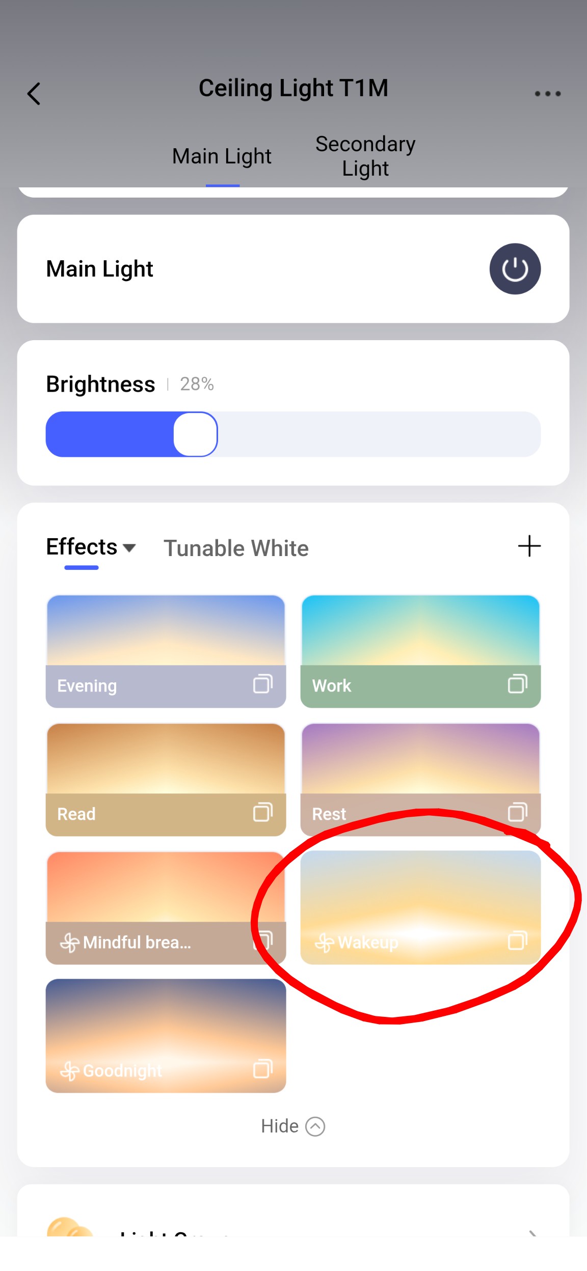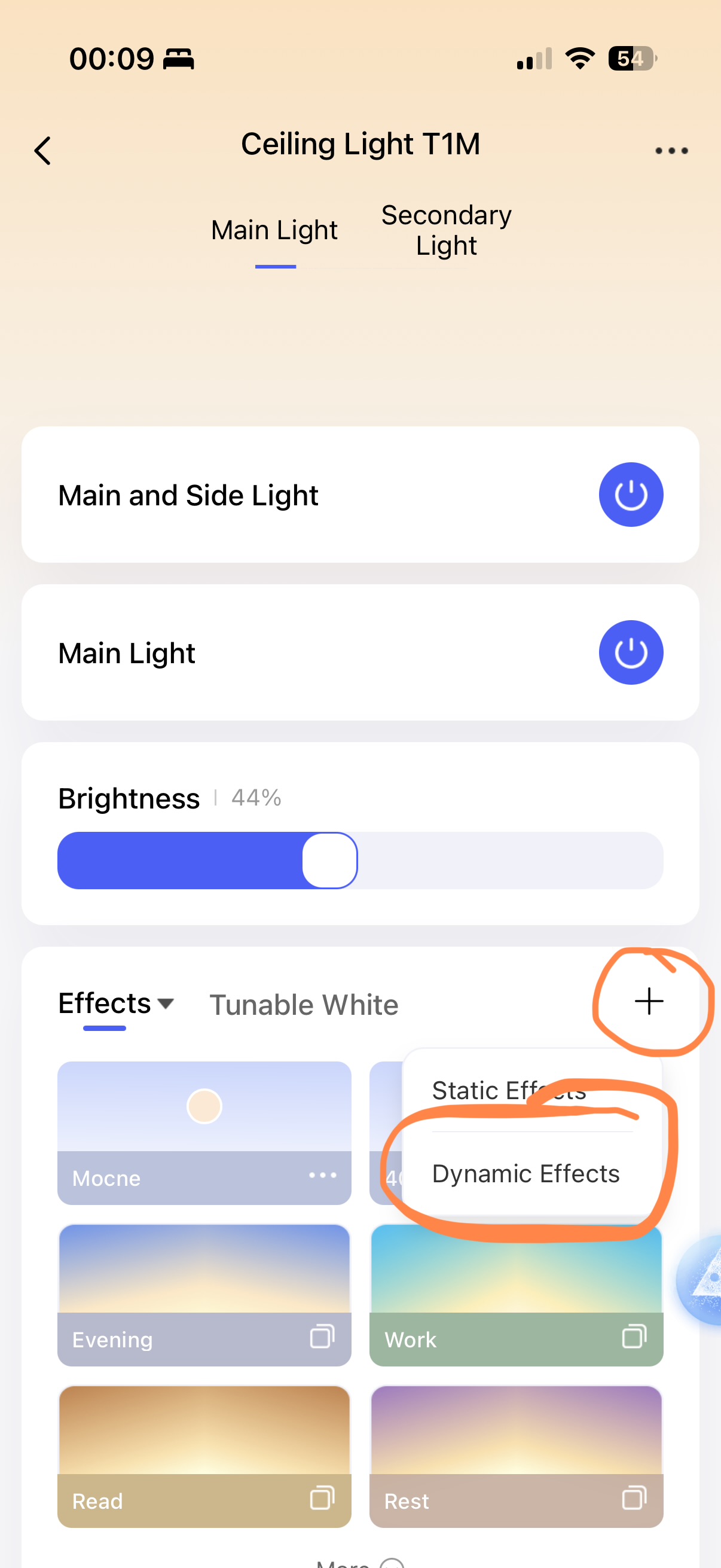 If you wish to manually configure the effect (instead of using the default Wake up), you can click “Main Light”, then +, then “Dynamic effect”.