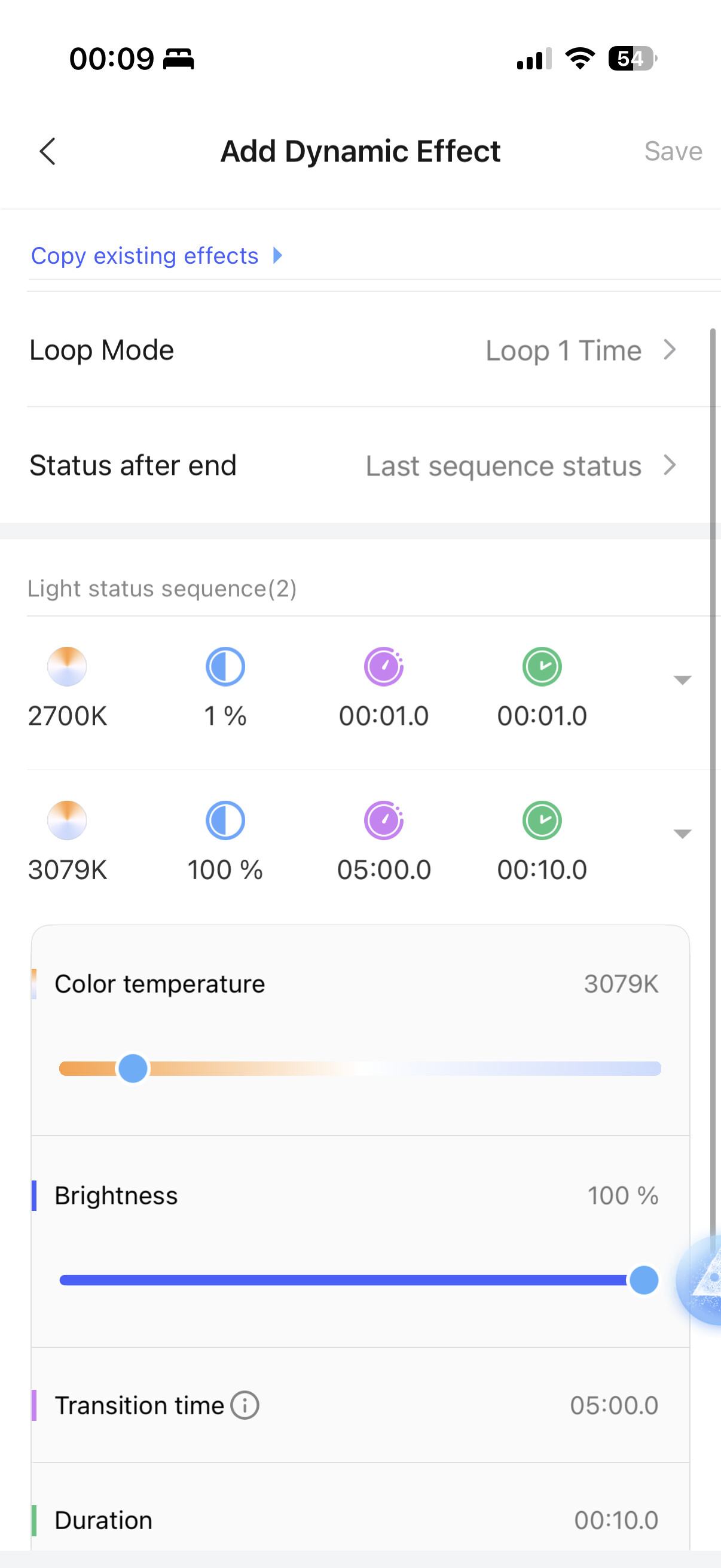 Example (transition from 2700K 1% to 3079K 100% in 5min):
