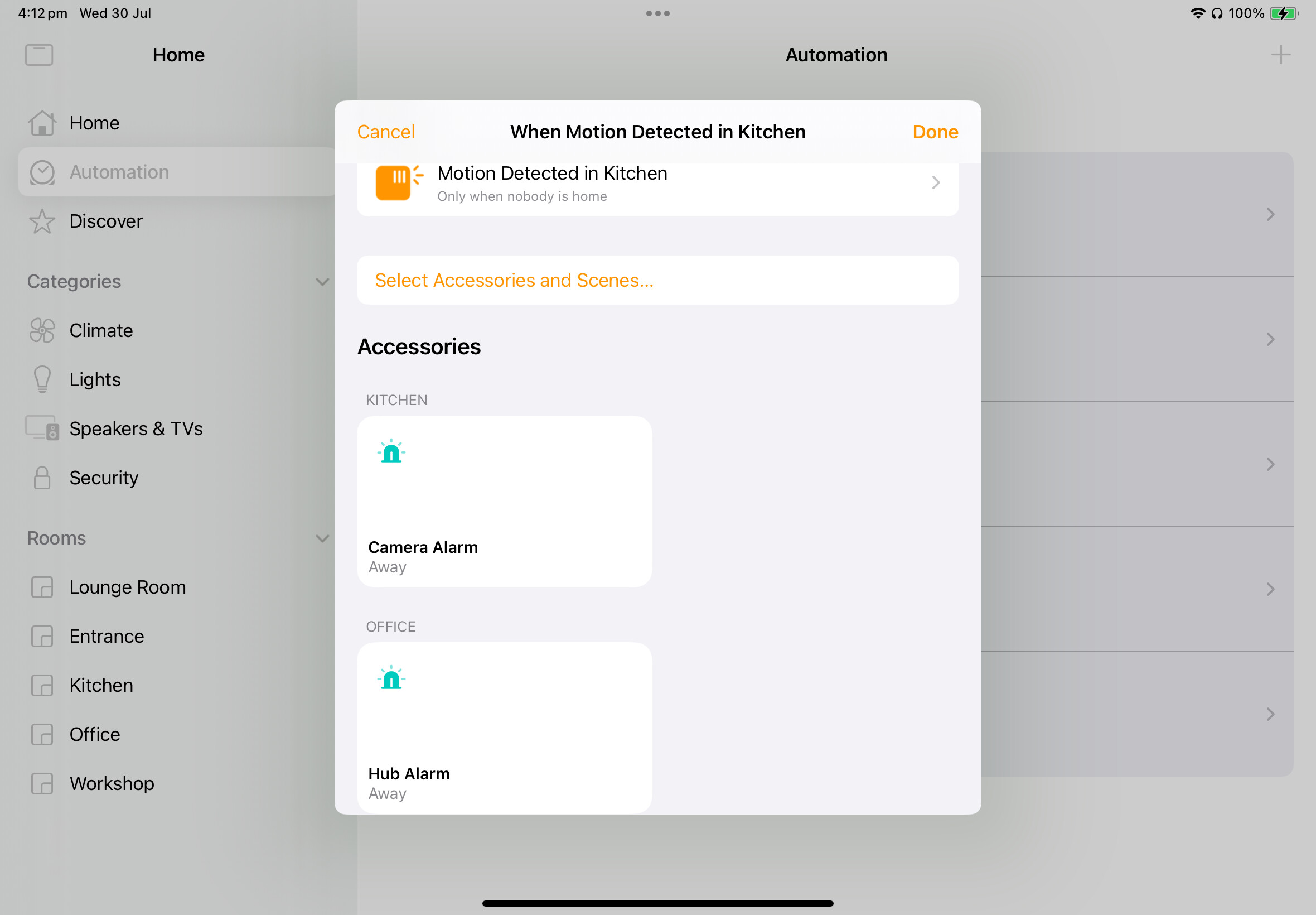 I have created an automation to set both alarms to “away” when we leave the unit, and “off” when we come home. Both automations sound an alarm off/on sound when testing.