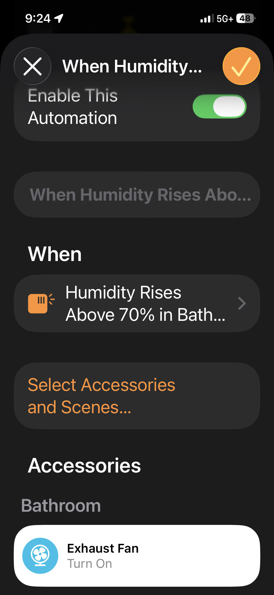 I had tried making an automation to automatically turn the fan on when the humidity rises above 40%, but I found it was triggering when nobody was in the bathroom. That’s part of why I want it to be a scene.