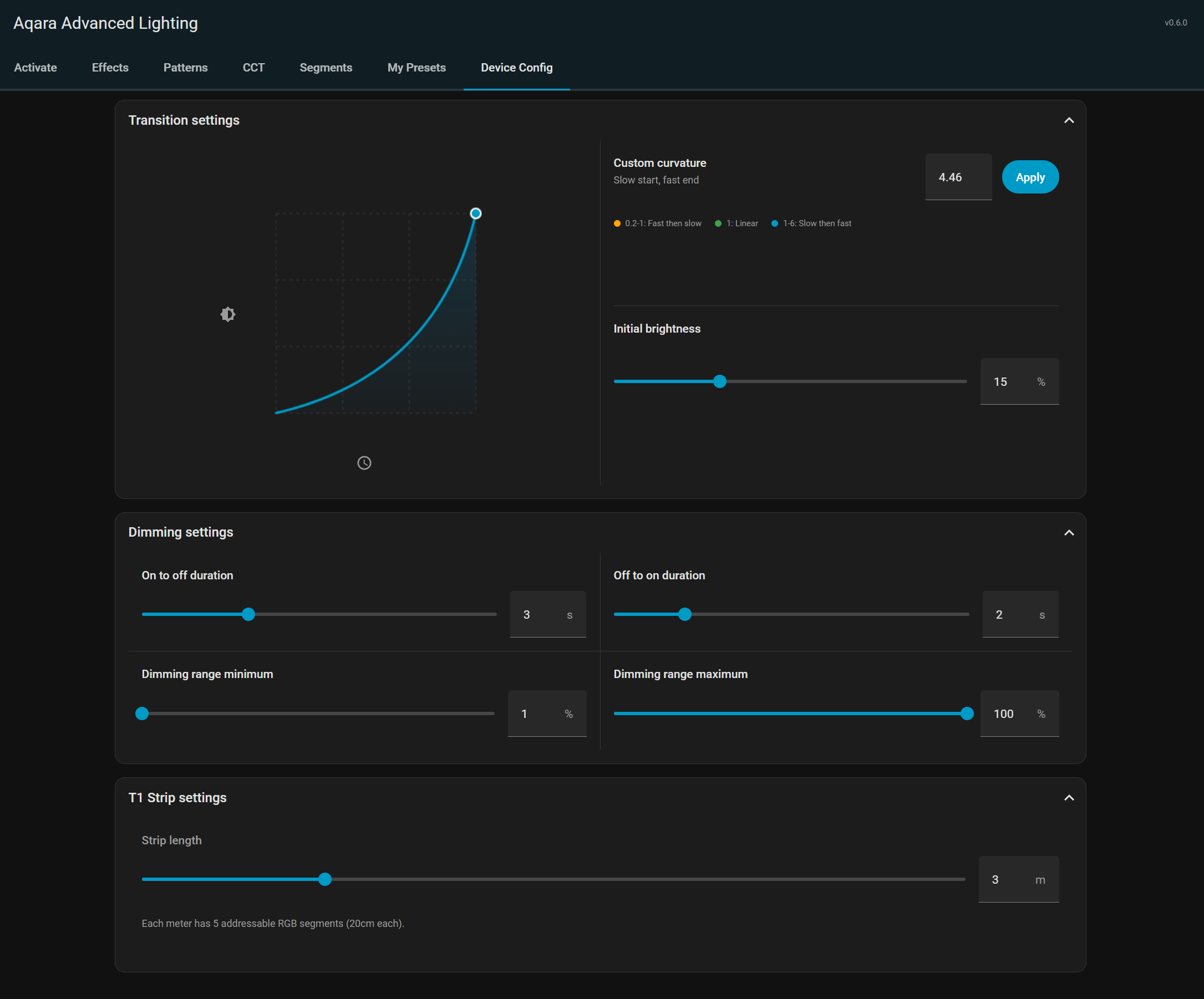 New in v0.6.0 is a Device Config panel which allows you to apply configuration settings to multiple Aqara lights at the same time. Available settings are filtered according to which kind of devices are selected, and only the compatible settings are sent to each device.