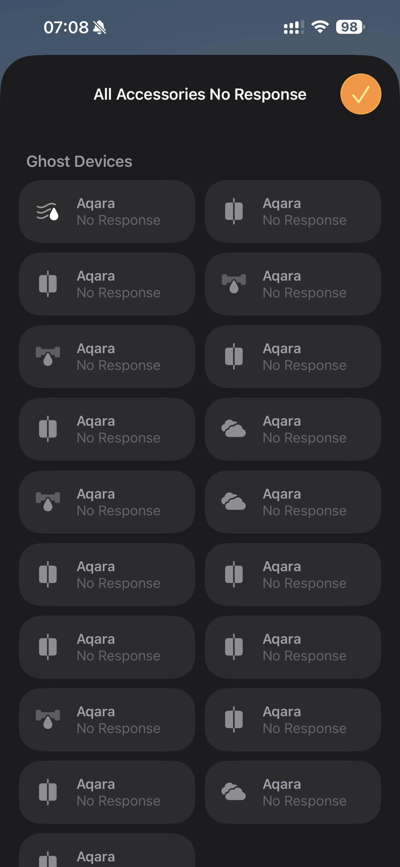 When I did install it again, was fine and no decide is linked to it but when I bring the Aqara Hub into Home App, it shows all 22 sensors offline.