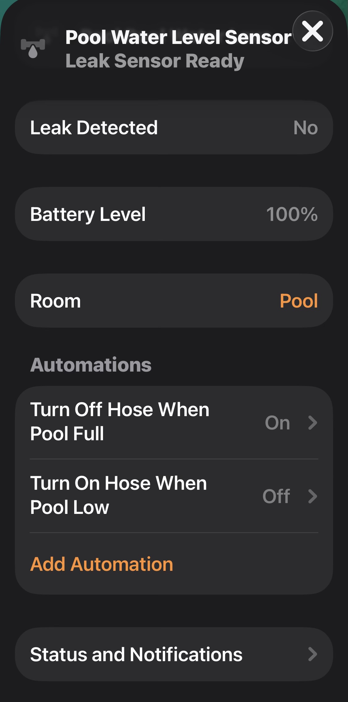If you click on the leak sensor and go into the accessory settings, scroll down to Status and Notifications and click. Here you can turn off Activity Notifications. In this case, I prefer to get a specific notification from the Aqara App that the pool needs filling or is full versus HomeKit’s generic message. But, you can choose to turn off HomeKit activity notifications for the sensor and Aqara notifications as well.