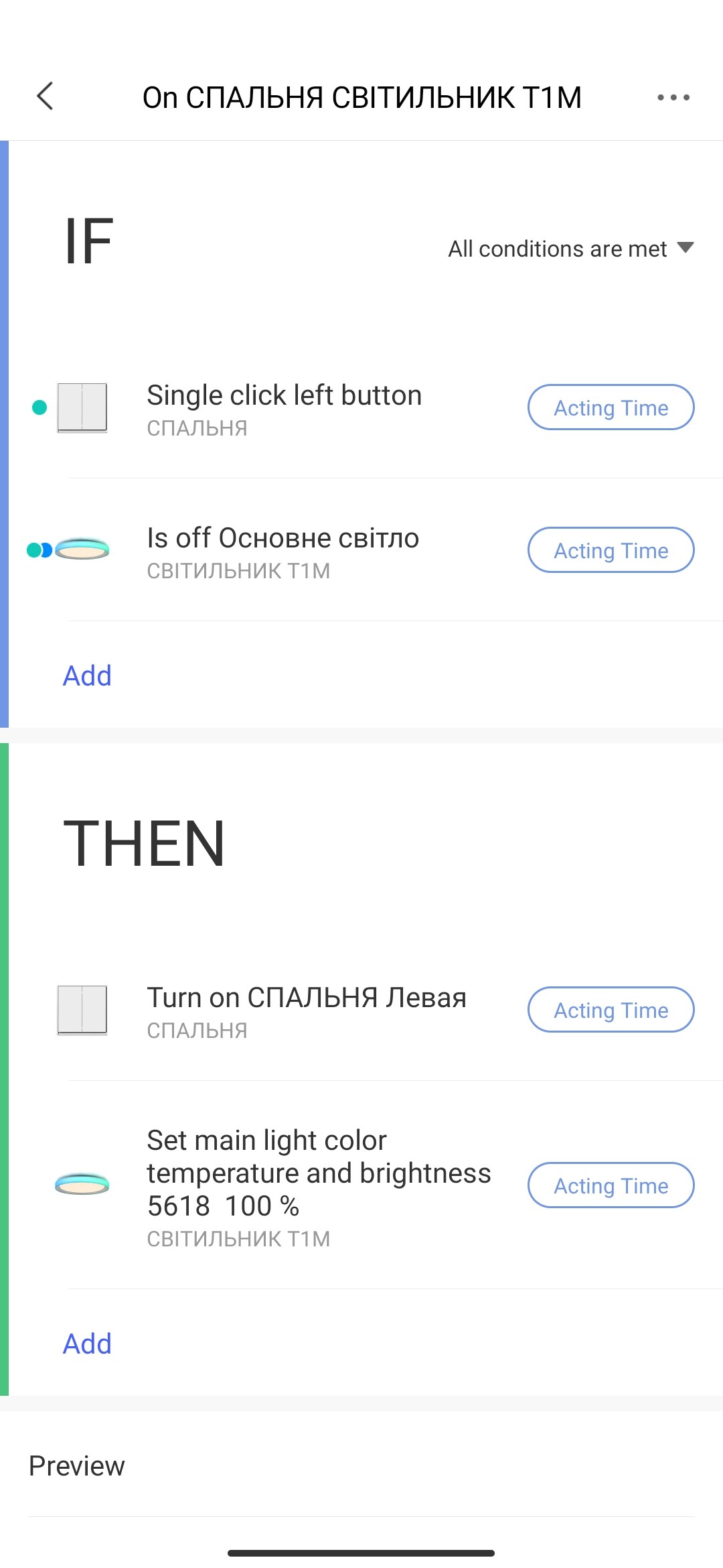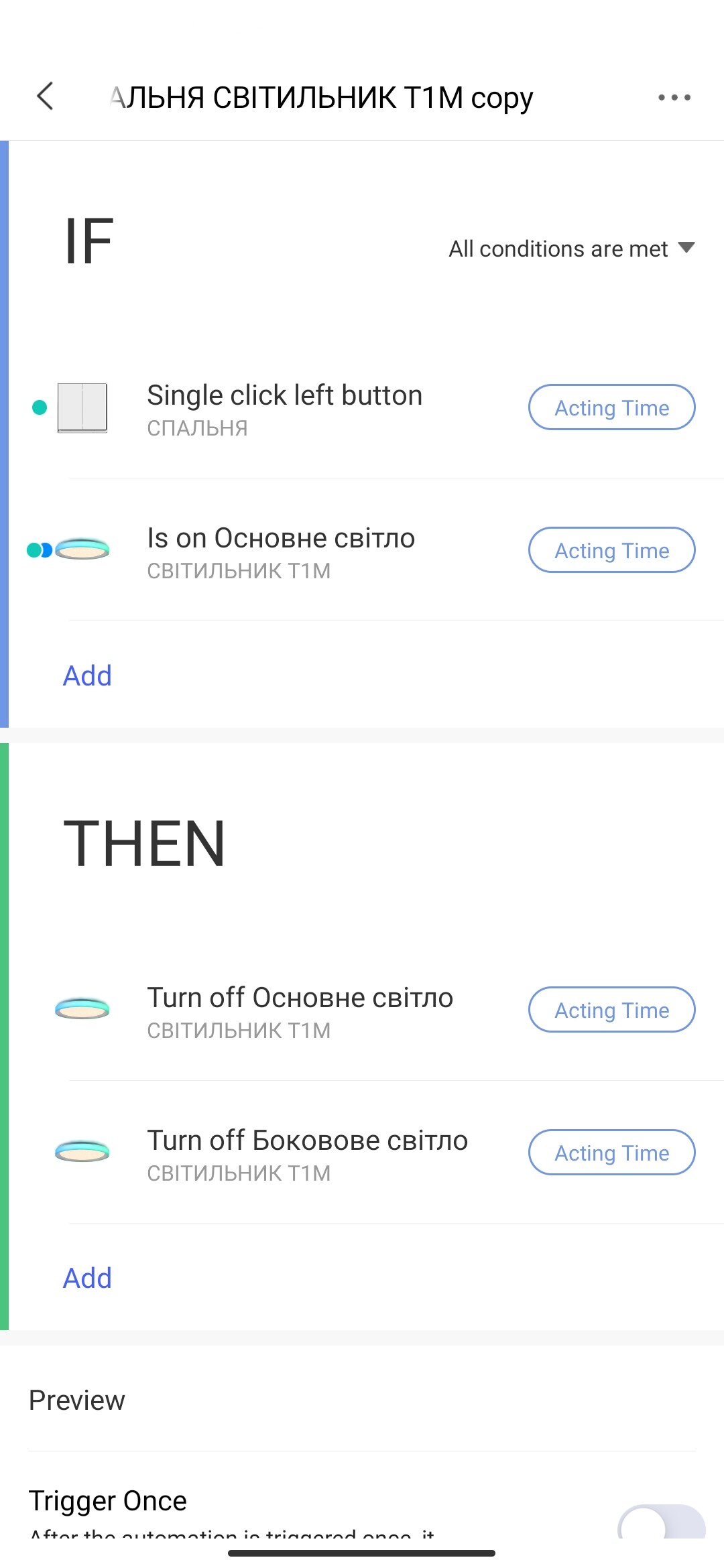 I untied the switch button, and made automations that are done for different combinations of the T1m lamp state. For a quick understanding, I give automation version 1.0