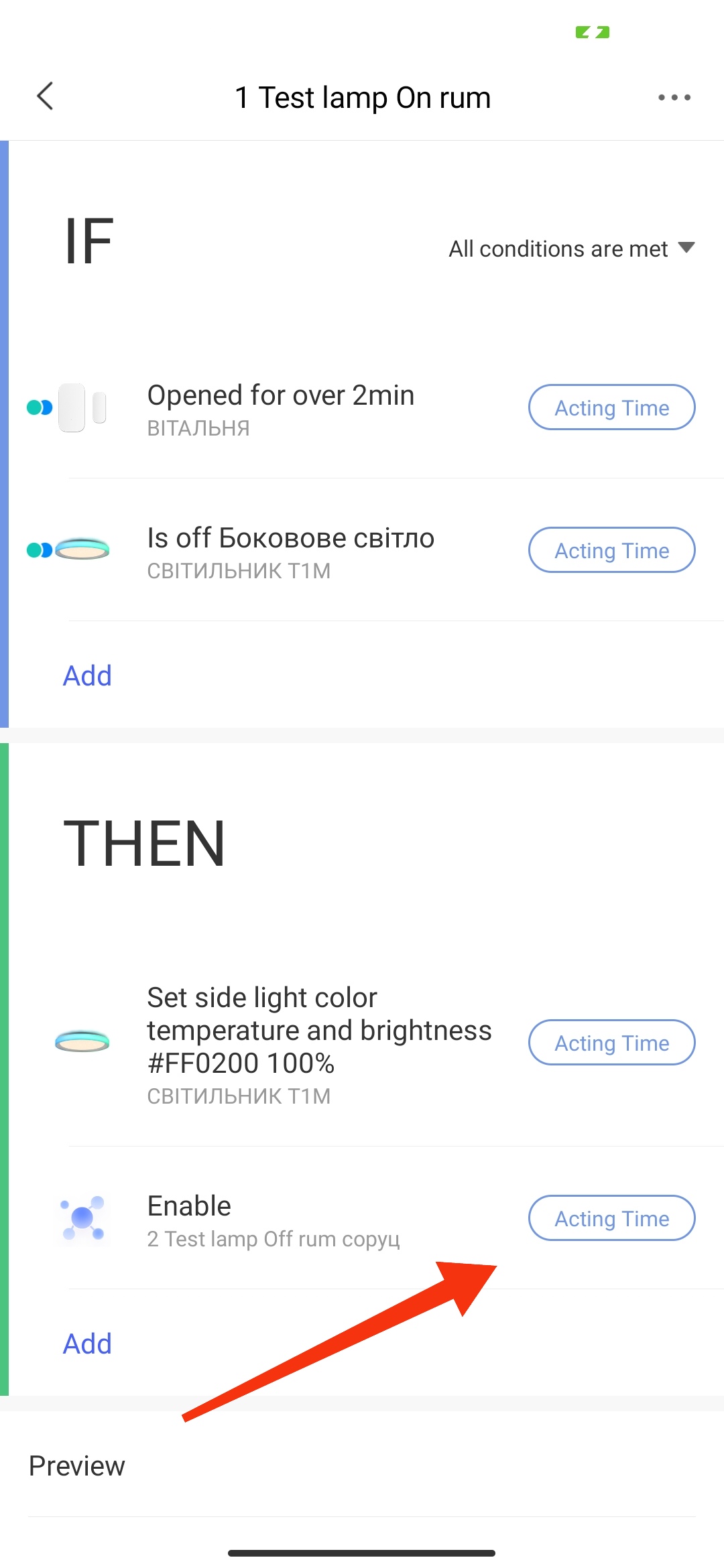 Hello. I made it on 1.0. 1 - if there is a light (turned on in the room) then someone is walking and working with the light, the door is open under human control, the red light is not on⦠2- the light is off (conditionally there is no one) the door is open for 2 minutes, the red light is on (attention, the door is not closed). 3 - the door is closed, the light is off. The first automation turns on the second when there is a condition (the door is open, the light is not on). The second automation, the single-action mode is turned on, the door is closed - turn off the light. If I understood what you wanted correctly. Regarding your lamps, I do not know their settings in the automations.