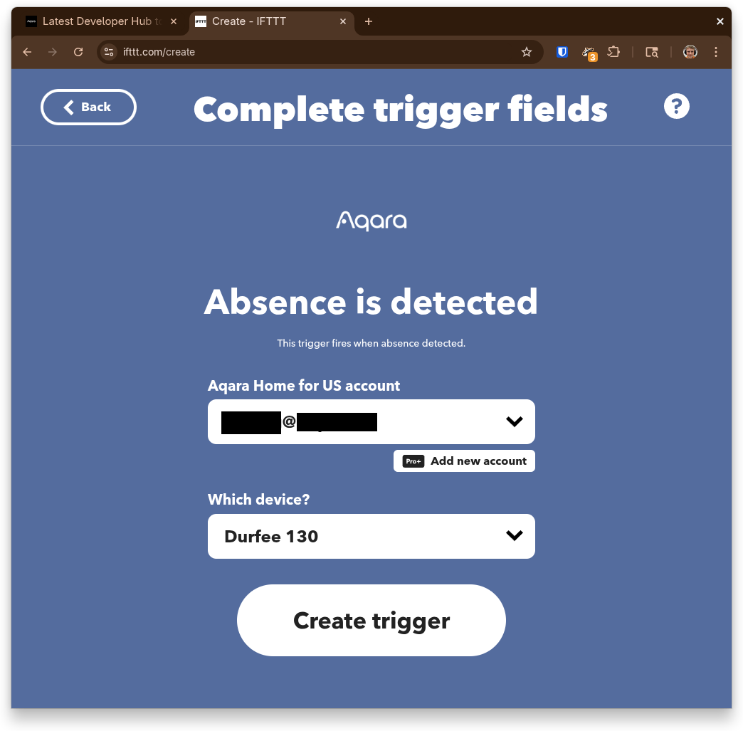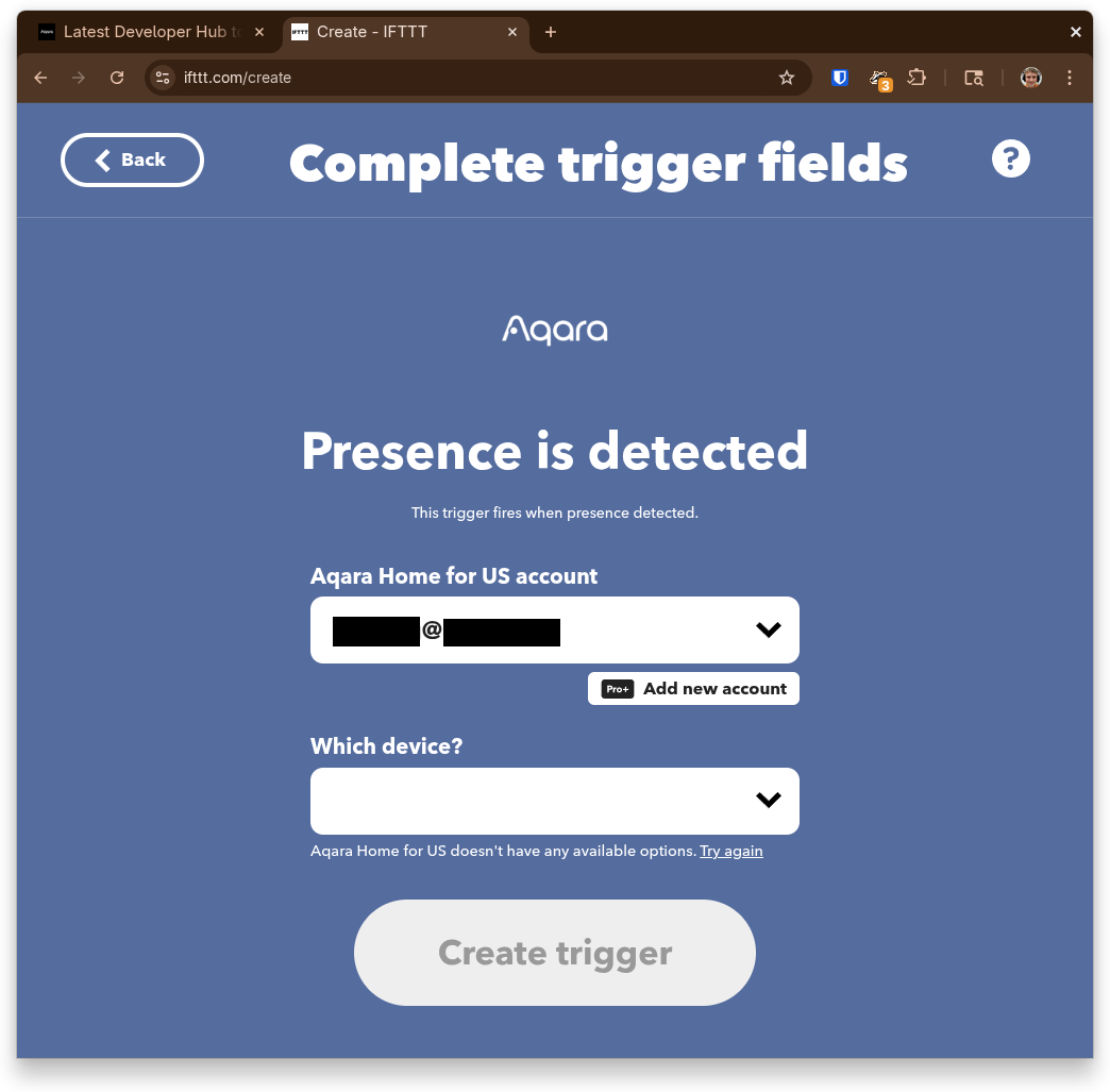 @xd1936 It looks like you’re experiencing an issue with setting up the “device detected a new presence” trigger for your Aqara Presence Sensor FP2 on IFTTT. Based on the reference information provided, the Aqara Presence Sensor FP2 supports various automations and scenes, including presence detection. However, the issue you’re facing seems specific to the IFTTT integration.