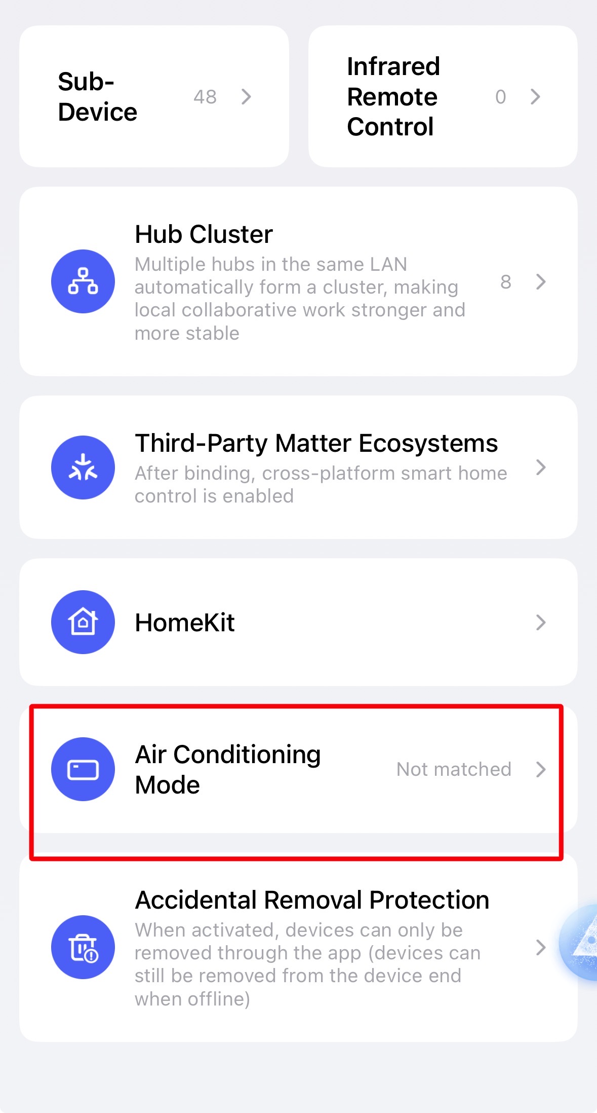 - When I connect via Matter / Third-Party Ecosystem, the Aqara System does not appear and can’t control the aqara status modes (Off / Home / Away / Night) in Apple Home.